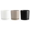 4 Living Collection blomsterpotte med skål Tapiola basic 15 cm er en enkel og tidløs potte i stentøy med fastmontert underskål. Potten har dreneringshull i bunnen, slik at overflødig vann samles i skålen og beskytter underlaget. Den matte overflaten gir et rolig uttrykk som passer i de fleste hjem. Finnes i tre farger: matt hvit, matt svart og matt greige – assortert, plukkes tilfeldig ved netthandel, skriv preferanse i kommentarfelt.