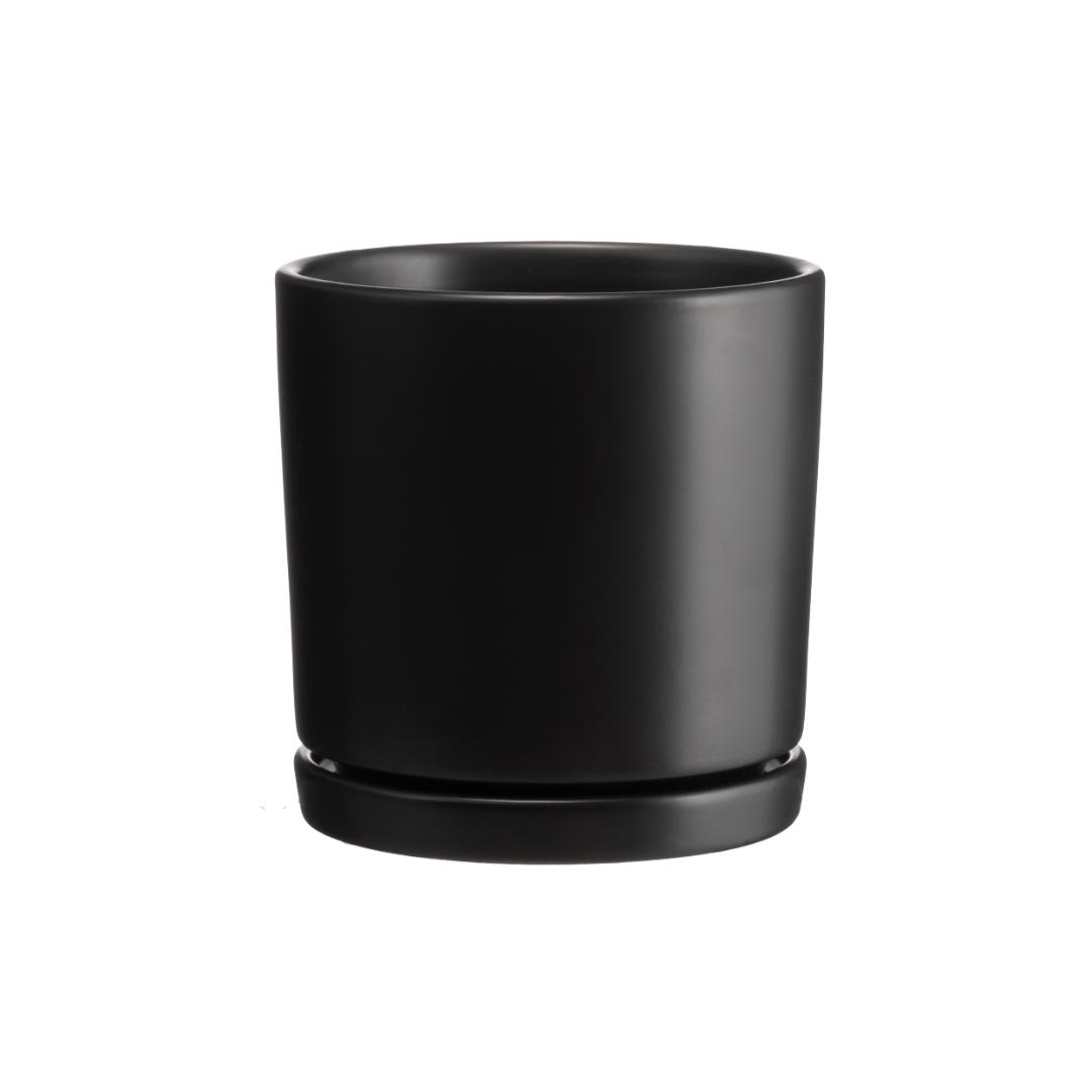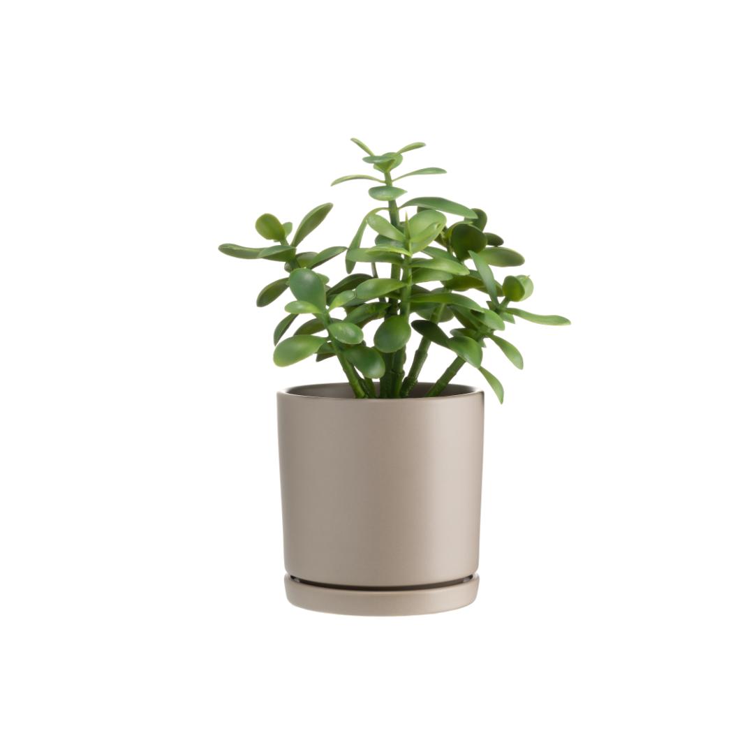 4 Living Collection blomsterpotte med skål Tapiola basic 15 cm er en enkel og tidløs potte i stentøy med fastmontert underskål. Potten har dreneringshull i bunnen, slik at overflødig vann samles i skålen og beskytter underlaget. Den matte overflaten gir et rolig uttrykk som passer i de fleste hjem. Finnes i tre farger: matt hvit, matt svart og matt greige – assortert, plukkes tilfeldig ved netthandel, skriv preferanse i kommentarfelt.