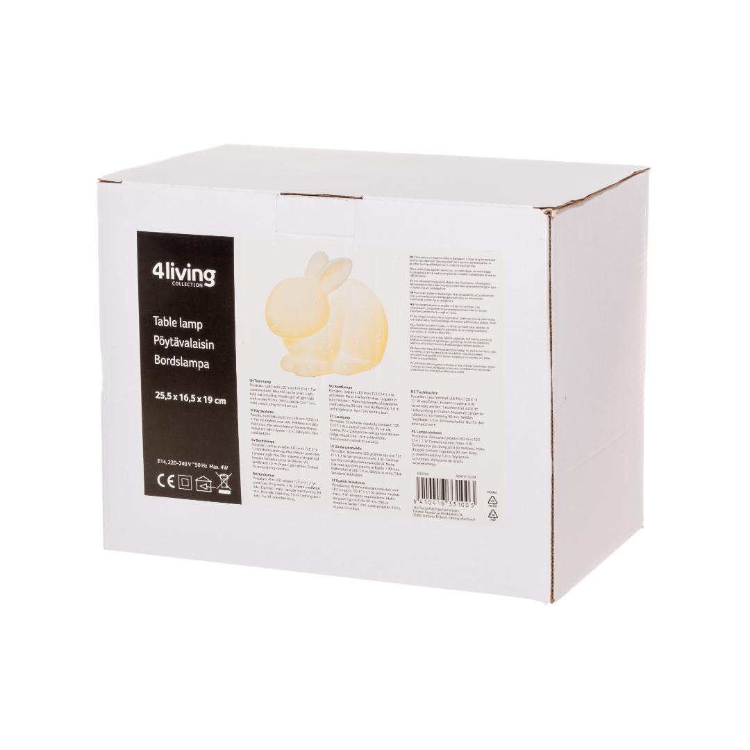 4 Living Collection bordlampe Bunny er en hvit bordlampe i porselen formet som en liten kanin, perfekt på nattbord, kommode eller i vinduskarm. Lyset skinner mykt gjennom porselenet og gir en behagelig glød som ikke virker sjenerende for øynene. Lampen har E14-sokkel og hvit tekstilledning på ca. 1,5 meter med bryter på ledningen. Anbefalt lyskilde er LED mini T25 1,1 W (maks 4 W, ikke inkludert).