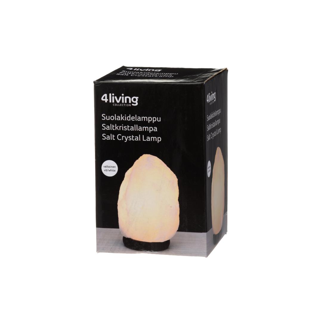 4 Living Collection bordlampe rock salt white er en klassisk saltlampesokkel i hvit steinsalt som gir et mykt, behagelig lys i stue, gang eller soverom. Lampen er ca. 18 cm høy og veier mellom 1,5–2 kg, noe som gir et stødig inntrykk på bord, hylle eller nattbord. Den leveres med E14-pære (maks 15 W) og kobles til vanlig stikkontakt (230 V, klasse II). Lyset filtreres gjennom saltskiven og skaper en dempet, rolig stemning i rommet.