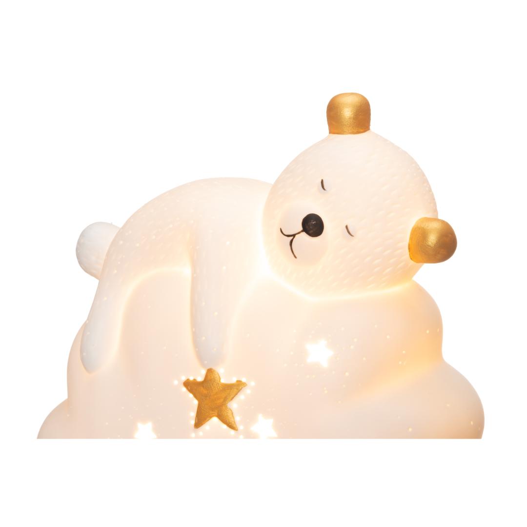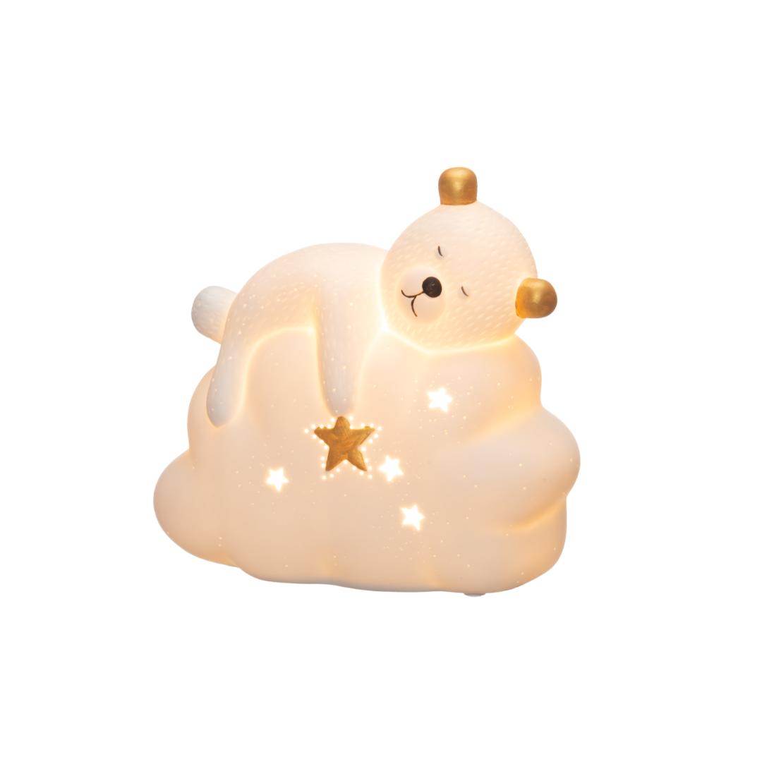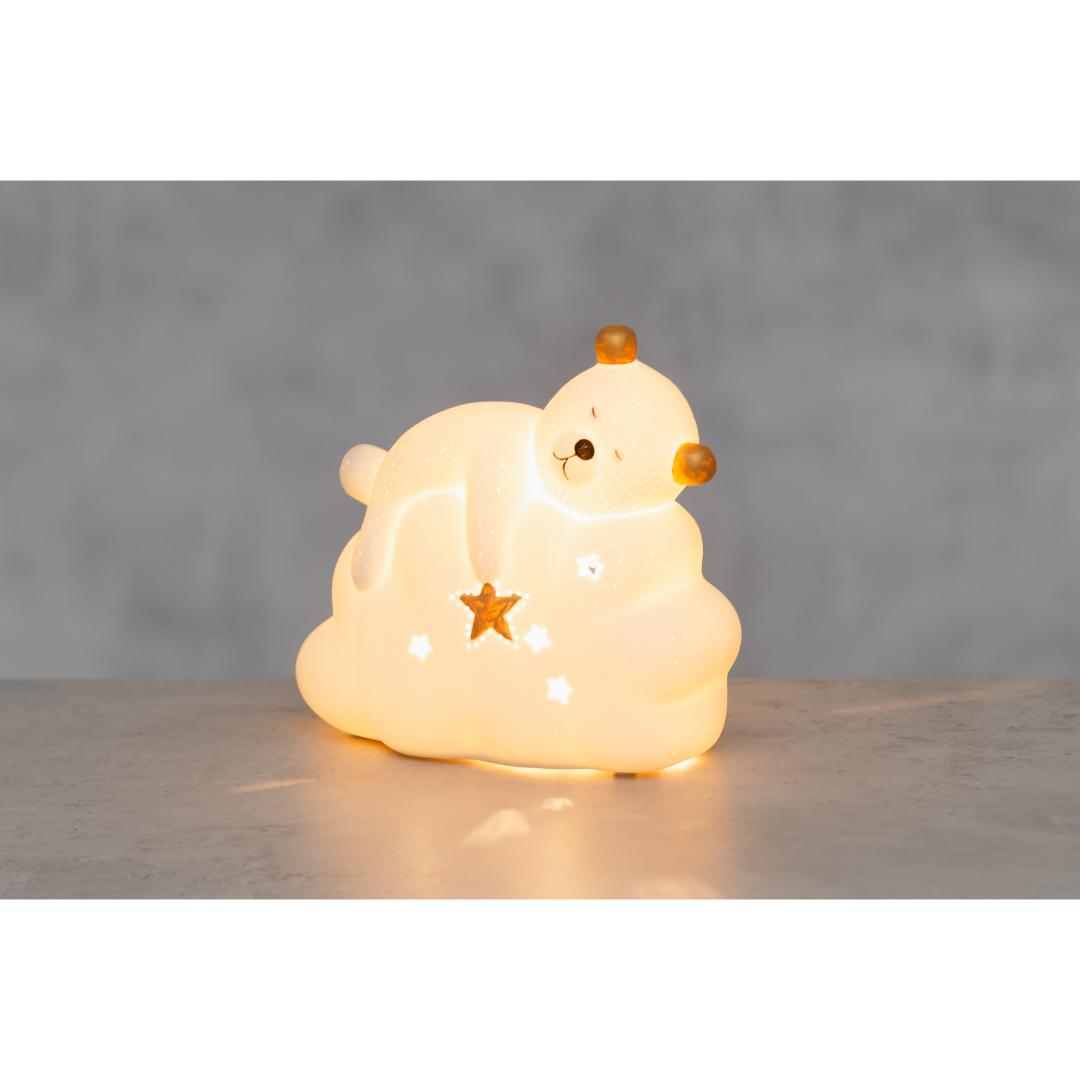 4 Living Collection bordlampe Teddy er en hvit porselenslampe formet som en bamse, ideell som nattlys på barnerommet. Lyset filtreres gjennom porselenet og gir en rolig og mild belysning som passer godt ved leggetid. Lampen har E14-sokkel (maks anbefalt 5 W / 470 lm) og hvit ledning på ca. 1,5 meter med bryter på kabelen. Lyskilde følger ikke med, og lampen er kun beregnet for innendørs bruk.