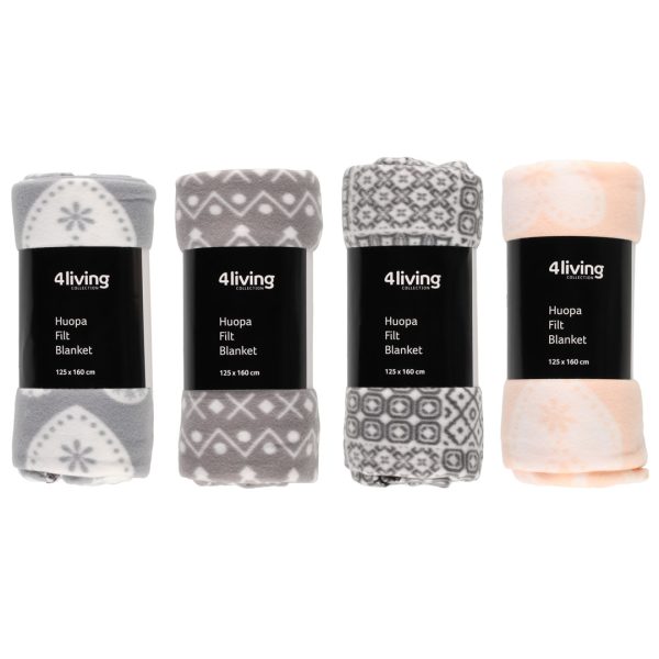 Mykt og varmt fleeceteppe. Størrelse 125 x 160 cm. Vaskes på 40 grader. 4 forskjellige farger/mønster assortert. Priset pr stk.