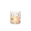 4 Living Collection glasslykt Meadow 13 cm er en dekorativ lykt i klart glass med fargerikt sommerblomster-motiv og krakelert overflate. Lyset fra telys eller liten blokklys skinner mykt gjennom glasset og skaper en lun stemning på bord, hylle eller vinduskarm. Lykten kan også brukes som en liten vase til avskårne blomster eller tørkede strå når den ikke brukes til lys.