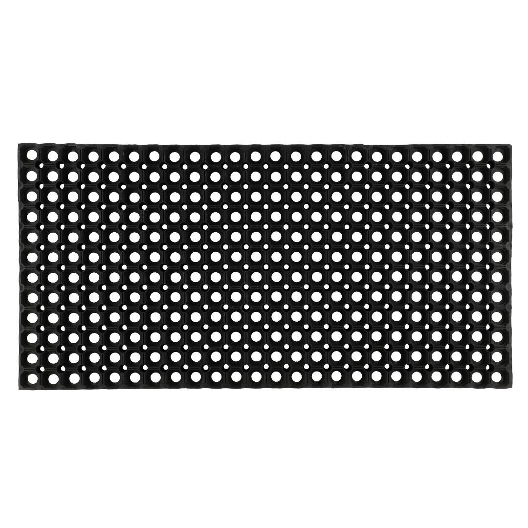 Solid gummimatte i størrelse 50 × 100 cm, laget av 100 % naturgummi. Passer godt ved inngangspartier og i garasjer, og slipper gjennom vann og smuss via hullmønsteret. Tykkelse 2,2 cm gir god stabilitet på underlaget.