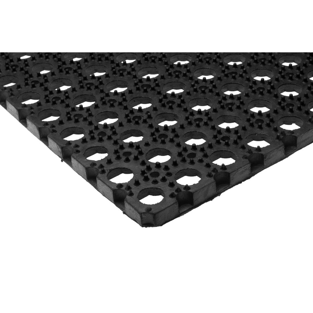 Gummimatte fra 4 Living Collection med hulldesign som lar skitt og vann renne gjennom. Egner seg for inngangspartier, garasjer og arbeidsområder. Den tunge naturgummien ligger stabilt på underlaget og tåler daglig bruk. Tykkelse 2,2 cm.