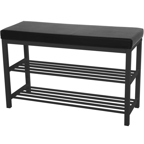 Stilig benk med metallramme til for eksempel gangen eller garderoben. Setet er laget av polstret skinn. To hyller for sko eller for oppbevaring av hansker og luer. Maksimal kapasitet 100 kg. Leveres umontert. Mål: 80 x 30 x 51 cm.