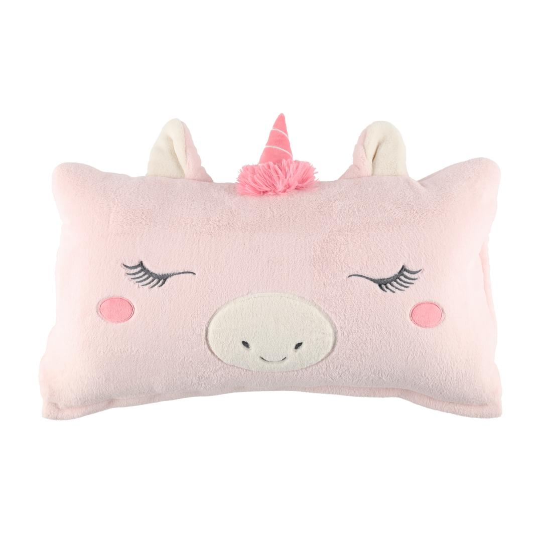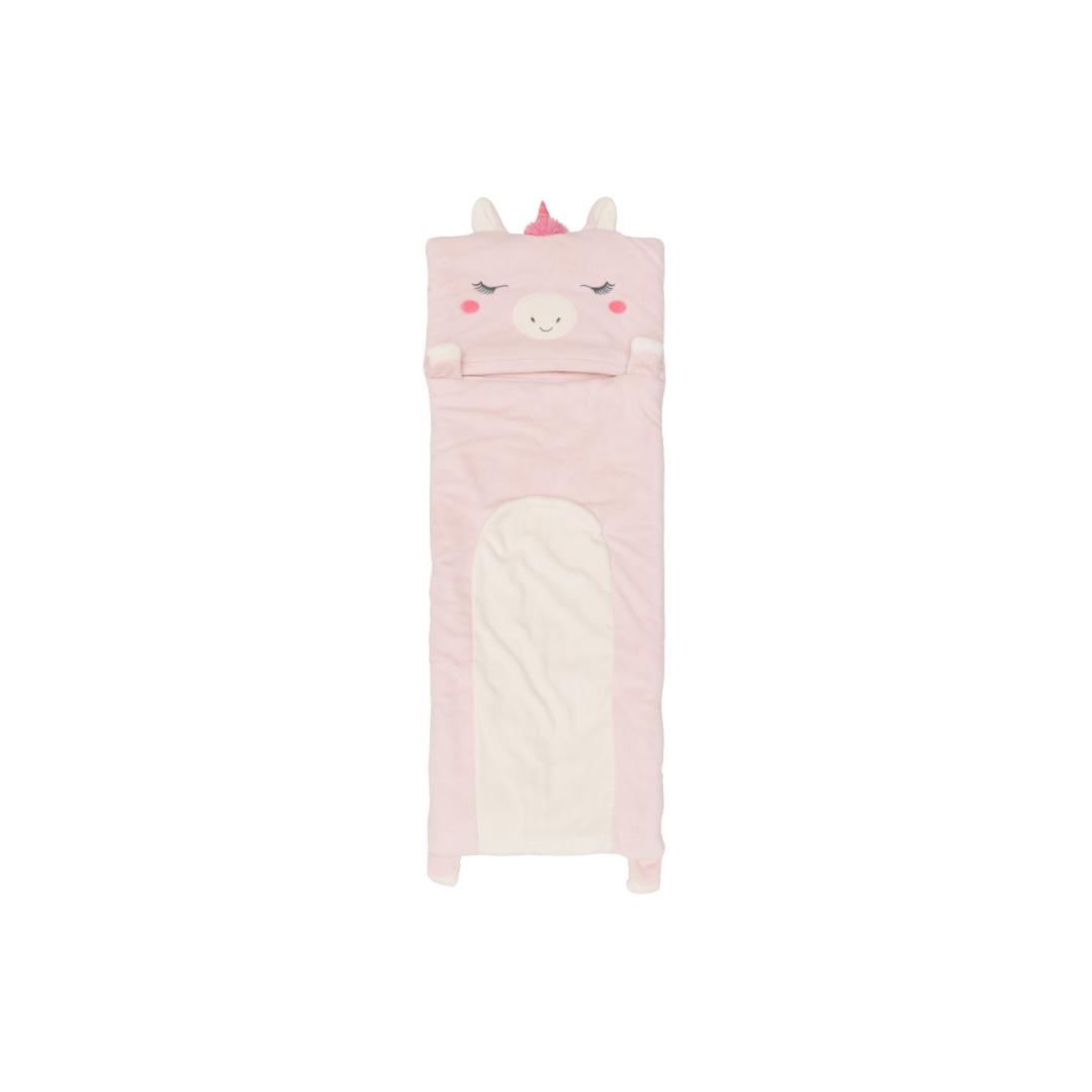 4 Living Collection sovepose-pute Unicorn er en rosa sovepose på 60 × 150 cm som kan brettes til en pute. Den er laget av myk fleece med 100 g polyesterfyll og har glidelås langs én side. Produktet er Ökotex-sertifisert.