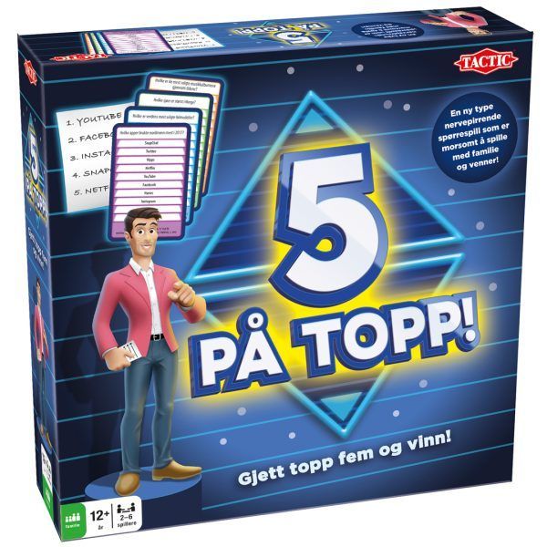 5 på topp er et spørrespill med en helt ny vri. Hvert spørsmål har ti svaralternativer som skal rangeres. Spillerne svarer alle på samme spørsmål med hver sin personlige topp 5-liste.