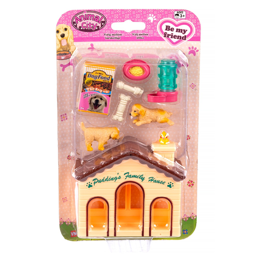 Inkluderer hundehus, 2 hunder, 2 bein, en vannskål, en matskål og en «eske» med hundemat. Ideelt for små dyreelskere som vil ha realistisk tilbehør til sine lekedyr.
