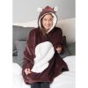 Acces Hoodie blanket Teddy er et oversized hettepledd i myk, brun flanellfleece med lyse innslag og søte “teddybjørnører” på hetten. Den store, vide passformen omslutter deg som et teppe, samtidig som ermene gjør det lett å lese, bruke mobil eller holde i en kopp kaffe. Frontlommen gir plass til små ting du vil ha innen rekkevidde. Én størrelse passer de fleste, og plagget kan vaskes på 40 grader.