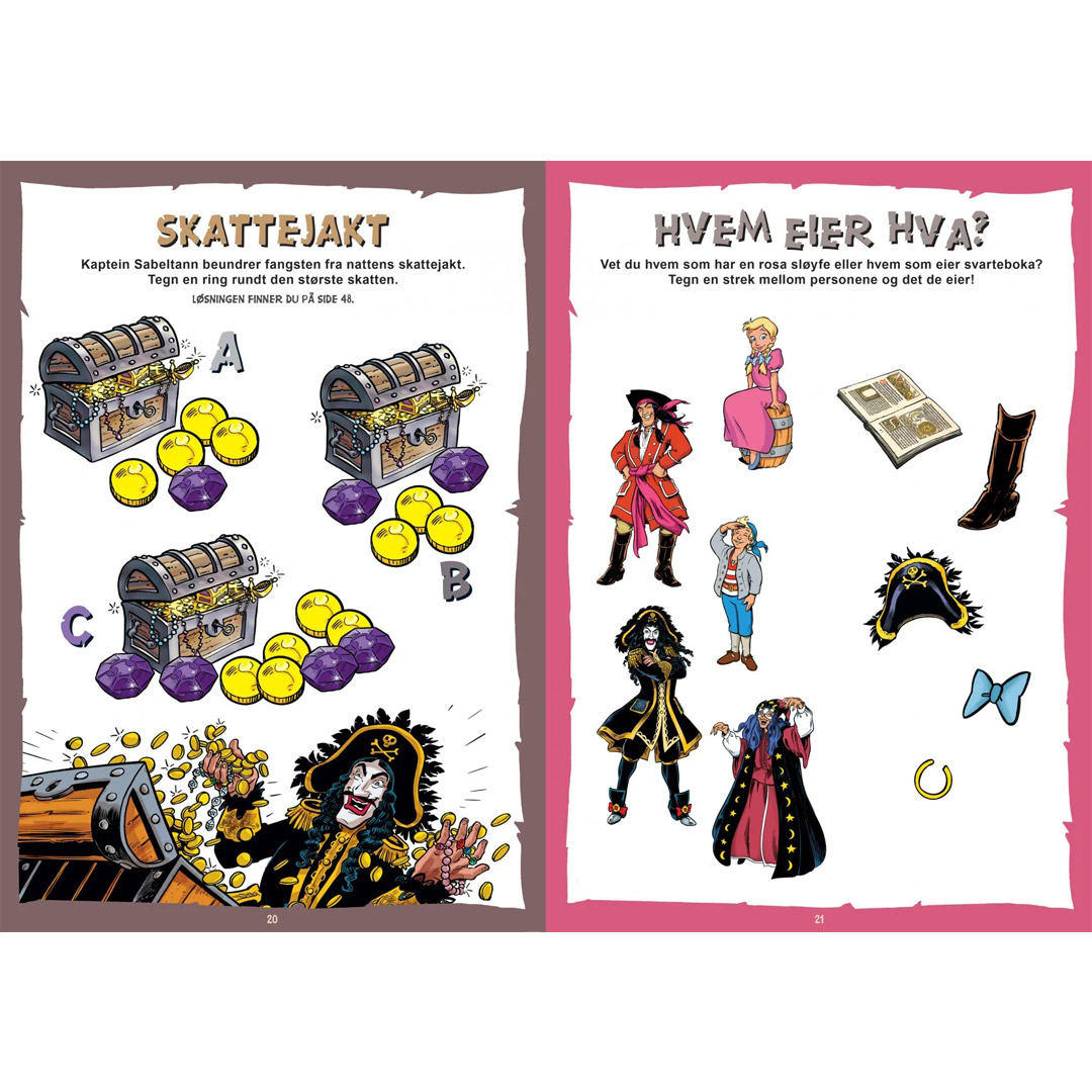 Katein sabeltann aktivitetsbok med klistremerker. Morsomme og utfordrende male- og aktivitetsbøker, med mange timers lek og læring og med mange ulike temaer. I denne spennende aktivitetsboken møter du flere av de kjente karakterene fra Kaptein Sabeltann! Finn fram blyanter og kos deg med sjørøvermoro for ramsalte sjørøvere og akterutseilte landkrabber! Du kan finne veien gjennom skattelabyrinter, fargelegge tøffe tegninger og løse mange spennende oppgaver! – Og er du glad i klistremerker, finner du ekstra mange av dem i denne boken! Format: A4, antall sider: 48.
