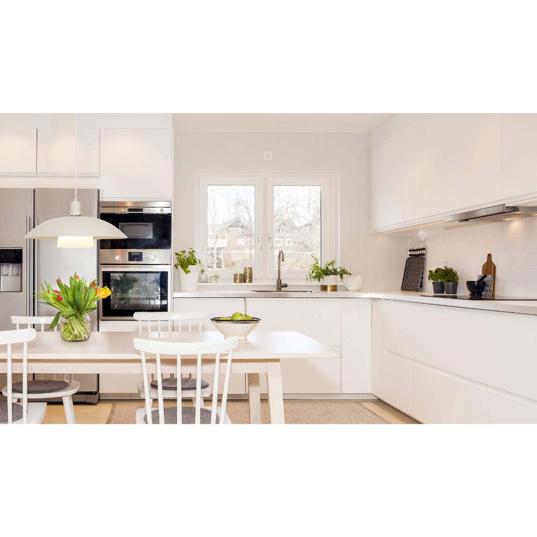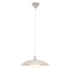 Alfa taklampe i hvitt metall og glass er en klassisk pendel som passer perfekt over spisebordet eller kjøkkenøyen. Lampen leveres med dekor i både krom og matt messing slik at du kan tilpasse uttrykket. Den gir et rent, balansert lys og kan enkelt henges i krok og justeres i høyden.