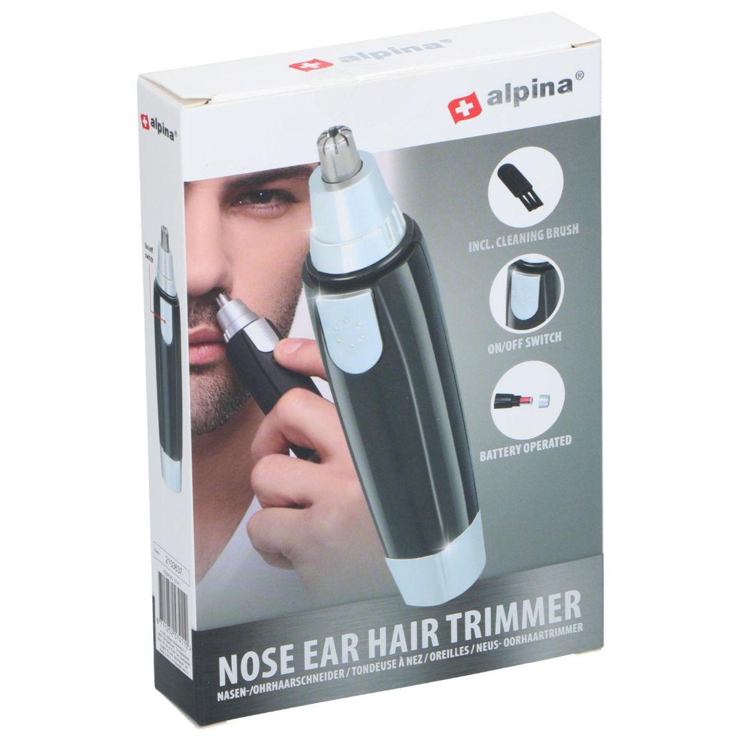 Alpina Switzerland nese- og ørehårtrimmer vaskbar i svart er en kompakt trimmer for enkel fjerning av små hår i nese og ører. Den ergonomiske formen gjør den lett å håndtere, og den er oppgitt som vanntett og vaskbar for enklere rengjøring. Trimmeren leveres med rengjøringsbørste og drives av batteri.