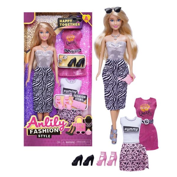 Anlily Fashion Style-settet kommer med flere forskjellige moteantrekk, inkludert kjoler, sko, en clutch-veske og solbriller. Perfekt for barn som elsker å kle opp dukkene sine og utforske ulike stiler.