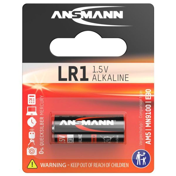 Ansmann LR1 batteri. 1,5 Volt. Mål: 12 x 12 x 30,2 mm. Vekt: 9 gram. Inneholder ikke kvikksølv.