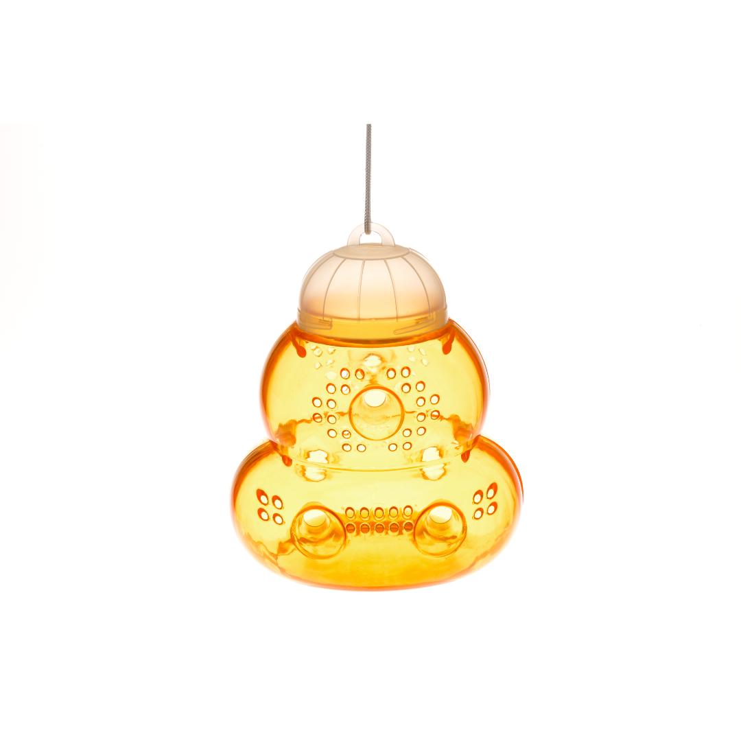 Hvepsfelle formet som en hvepsebol. Kan plasseres på et bord eller henges fra en gren eller krok. åpne bikuben og ha litt øl eller søt juice inne sammen med en spiseskje oppvaskmiddel. Veps vil bli tiltrukket av lukten, men vil ikke være i stand til å fly ut av fellen. Enkel å bruke, ingen farlige kjemikalier nødvendig.