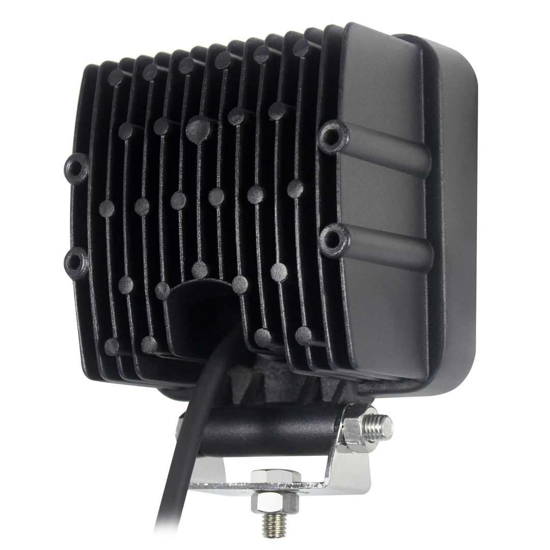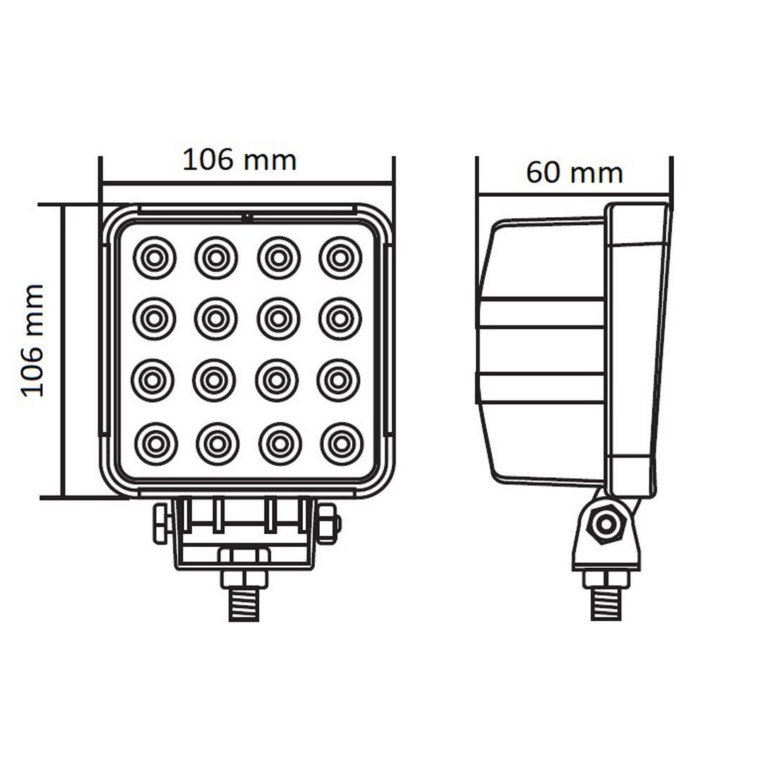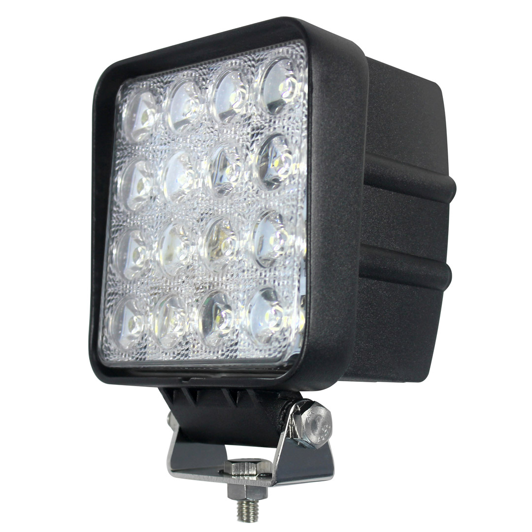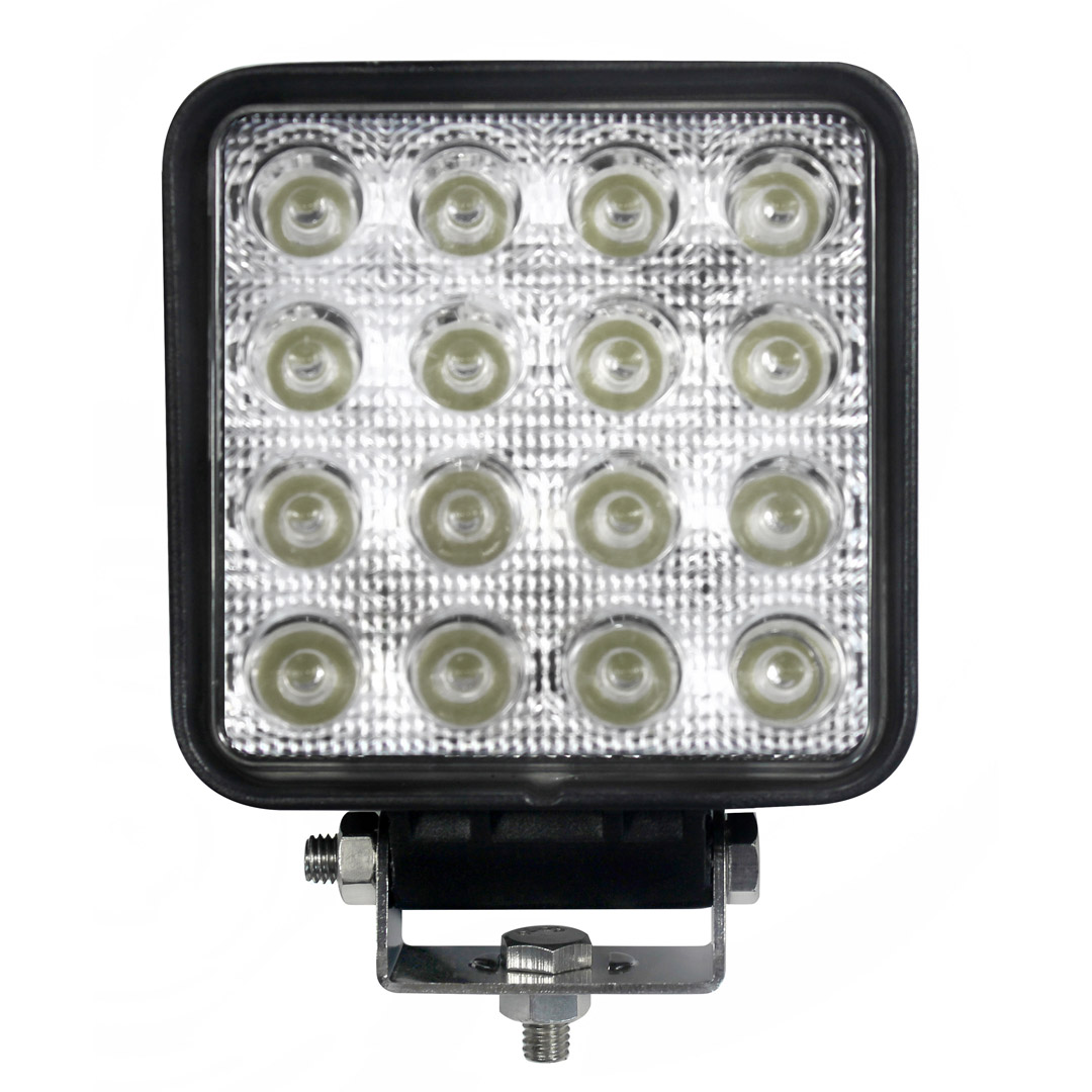 LED arbeidslampe for traktor, lastebil, fritidskjøretøy osv. 48W fordelt på 16*3W Epistar LED. 3520 Lumen. Flood lysmønster. Glass i polykarbonat, hus i aluminium og justerbar festebrakett i rustfritt stål. CE, RoHS og EMC R10 godkjent. Vanntett ihht: IP67. 10-30V. Str: 106x106x60 mm.