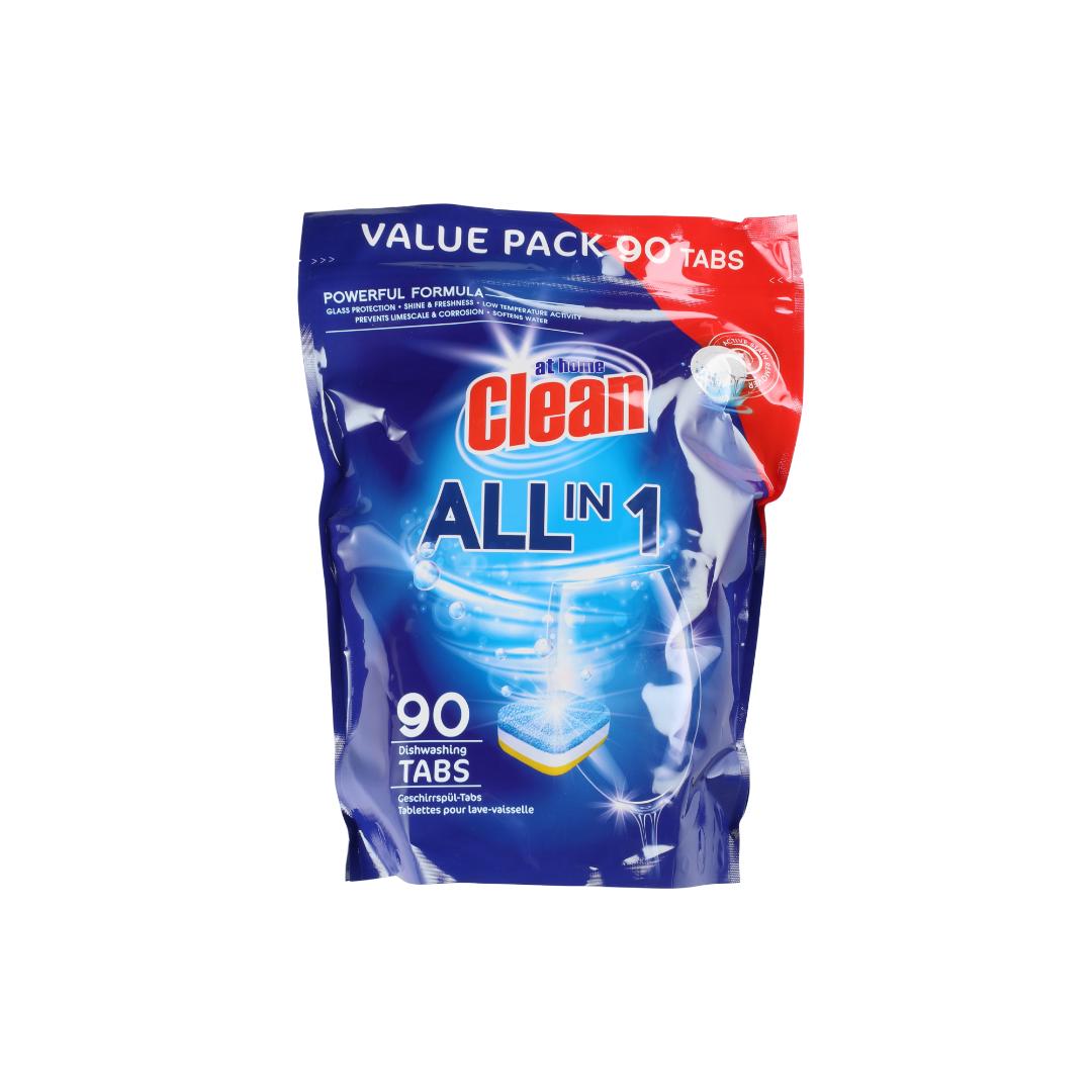 At home oppvaskmaskintabletter All in One 90 stk (20 g) er et effektivt alt-i-ett produkt for maskinoppvask som vasker oppvasken ren og frisk. Pakken inneholder 90 tabletter, og hver tablett veier 20 g. Produsert i EU.