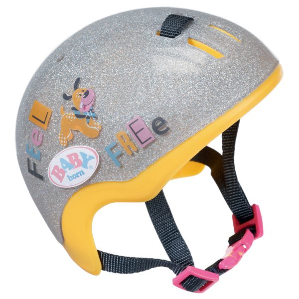Denne stilige, sølvfargede sykkelhjelmen som skinner i sollyset gir mer sikkerhet til din BABY Born dukkes sykkeltur, enten den skal sykle selv eller bare sitte på. Lukk og stram hakestroppen slik at hjelmen sitter godt på, og så er dukken (følger ikke med) klar for sykkeltur. Man kan selvfølgelig også bruke den stilige hjelmen til andre aktiviteter også, – kanskje til å gå på skøyter? Inneholder: BABY Born sykkelhjelm med stropper. Detaljer: Passer til dukker på ca. 43 cm. Alder: Fra 3 år. Merk: Dukke følger ikke med