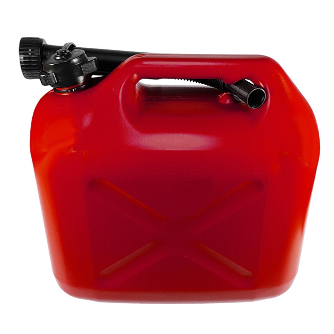 Nye Europeiske bensinkanner ? UN (FN) merket og godkjent. Be nsinkannei plast 10 liter rød, med helletut