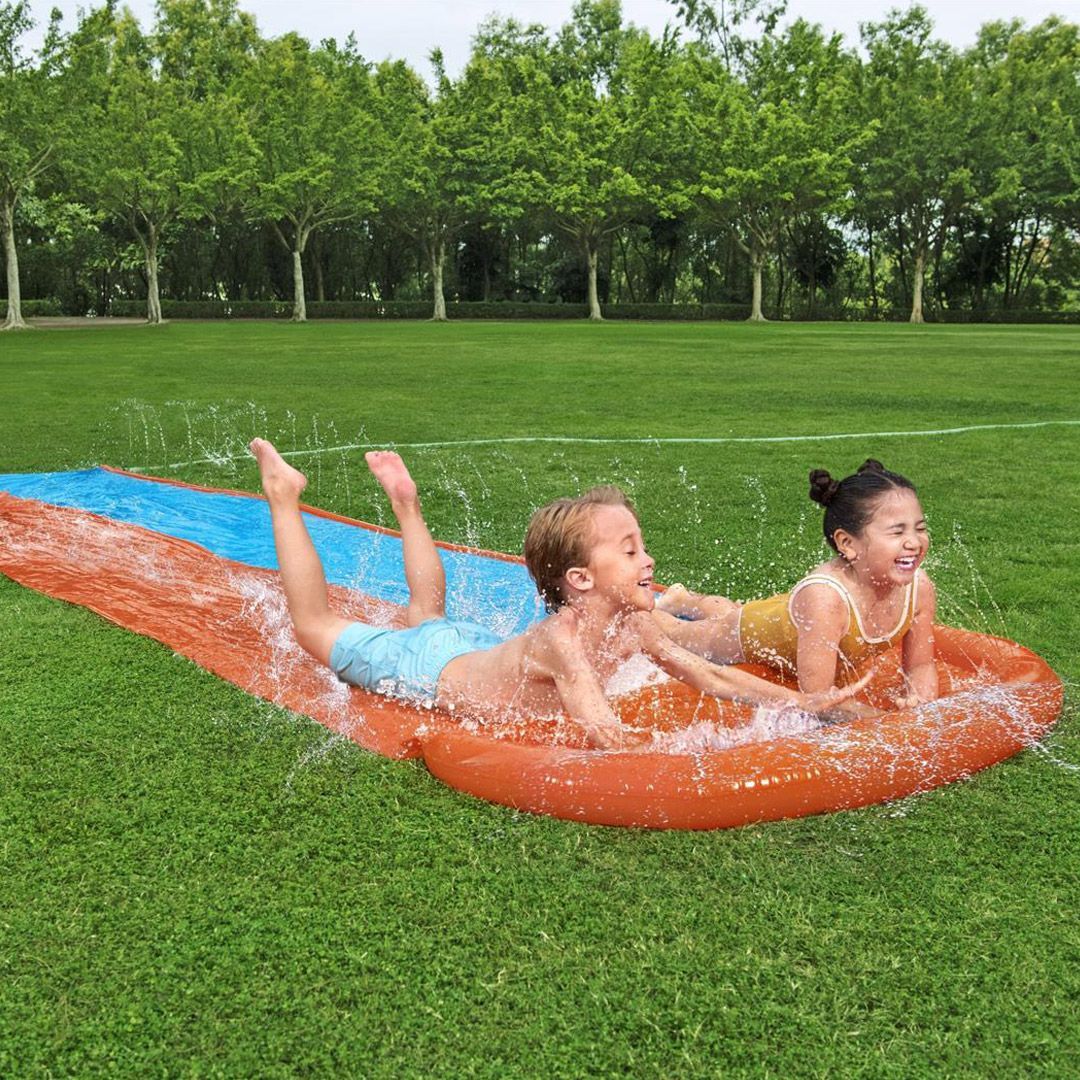 Bestway dobbel sklie gir dobbelt så mye moro! Hele 4,88 meter lang. Hvem sklir fortest? Legg den ut, kople til vannet og prøv.