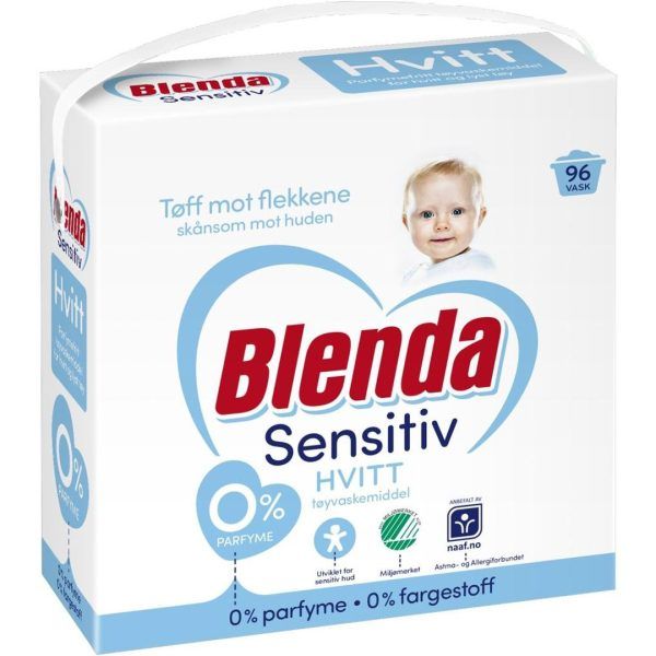 Med Blenda Sensitive hvitt slipper du å velge mellom rent tøy og skånsomhetmot huden. Uten parfyme og fargestoffer. Tar selv vanskelige flekker. Effektiv ved 40 grader. Trenger du vasketips? Se www. klesvask. no