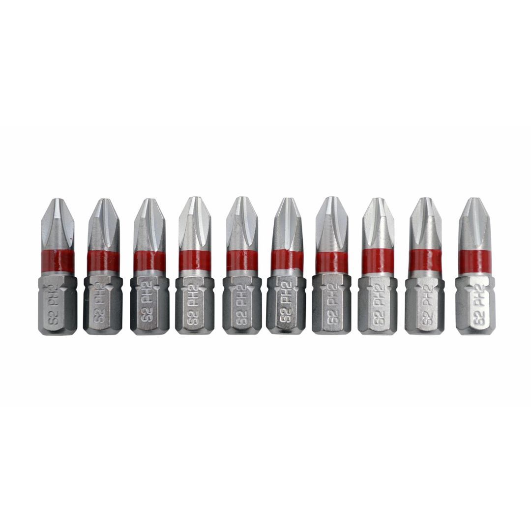 Bits PH2 x 10 stk. i eske. S2-stål. Lengde: 25 mm. x 1/4″. Rød fargekode.