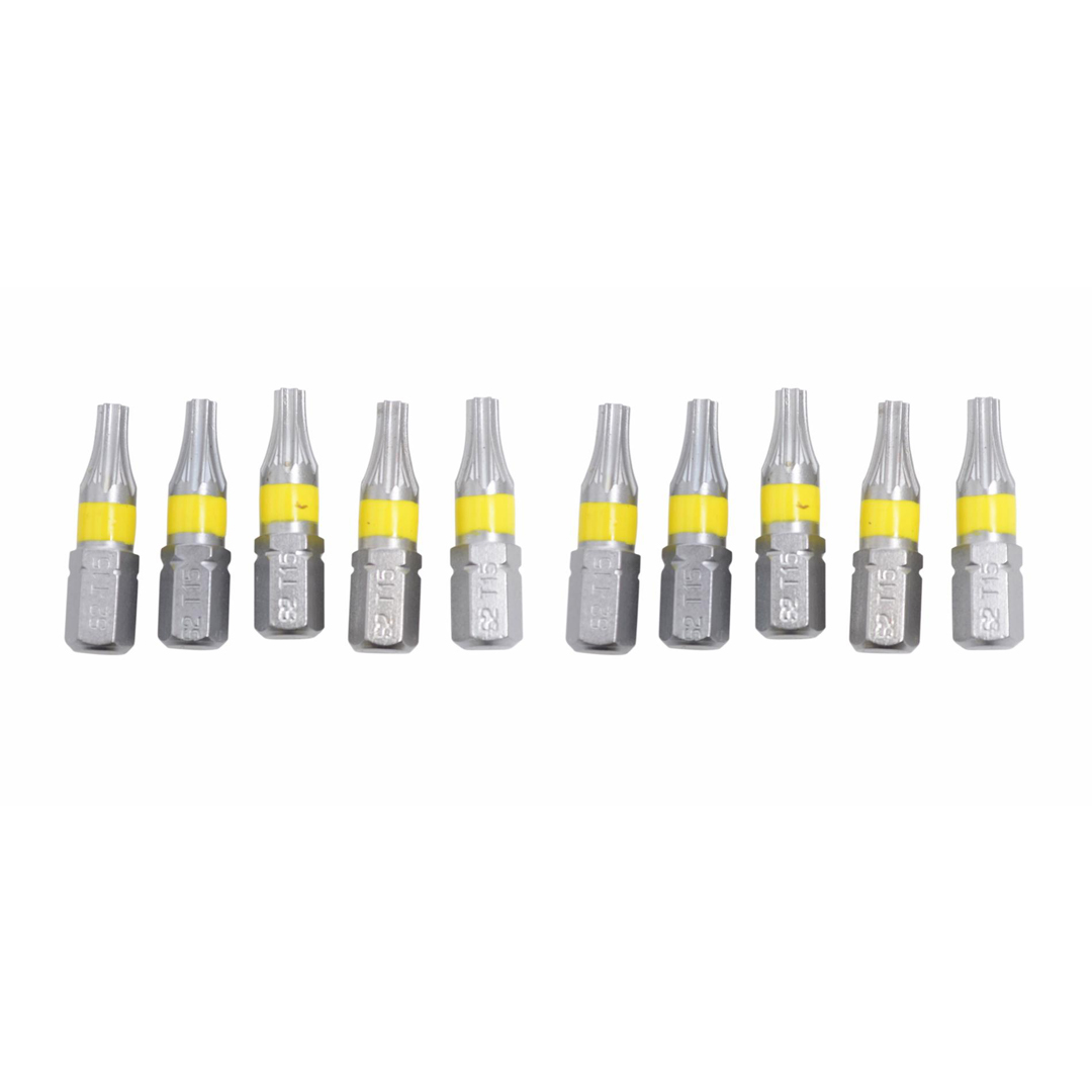 Bits TORX 15 x 10 stk. i eske. S2-stål. Lengde: 25 mm x 1/4″. Gul fargekode.