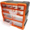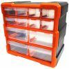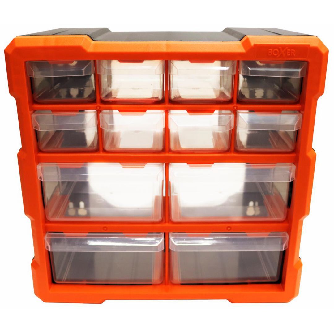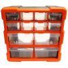 Sortimentkasse med 12 skuffer i klar plast. Kan henges på veggen eller stables. Ramme og skuffer i PP.