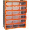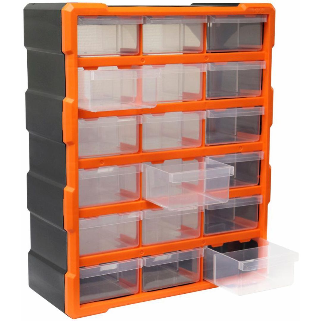 Sortimentkasse med 18 skuffer i klar plast. Kan henges på veggen eller stables. Ramme og skuffer i PP.