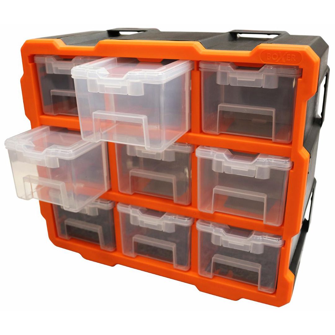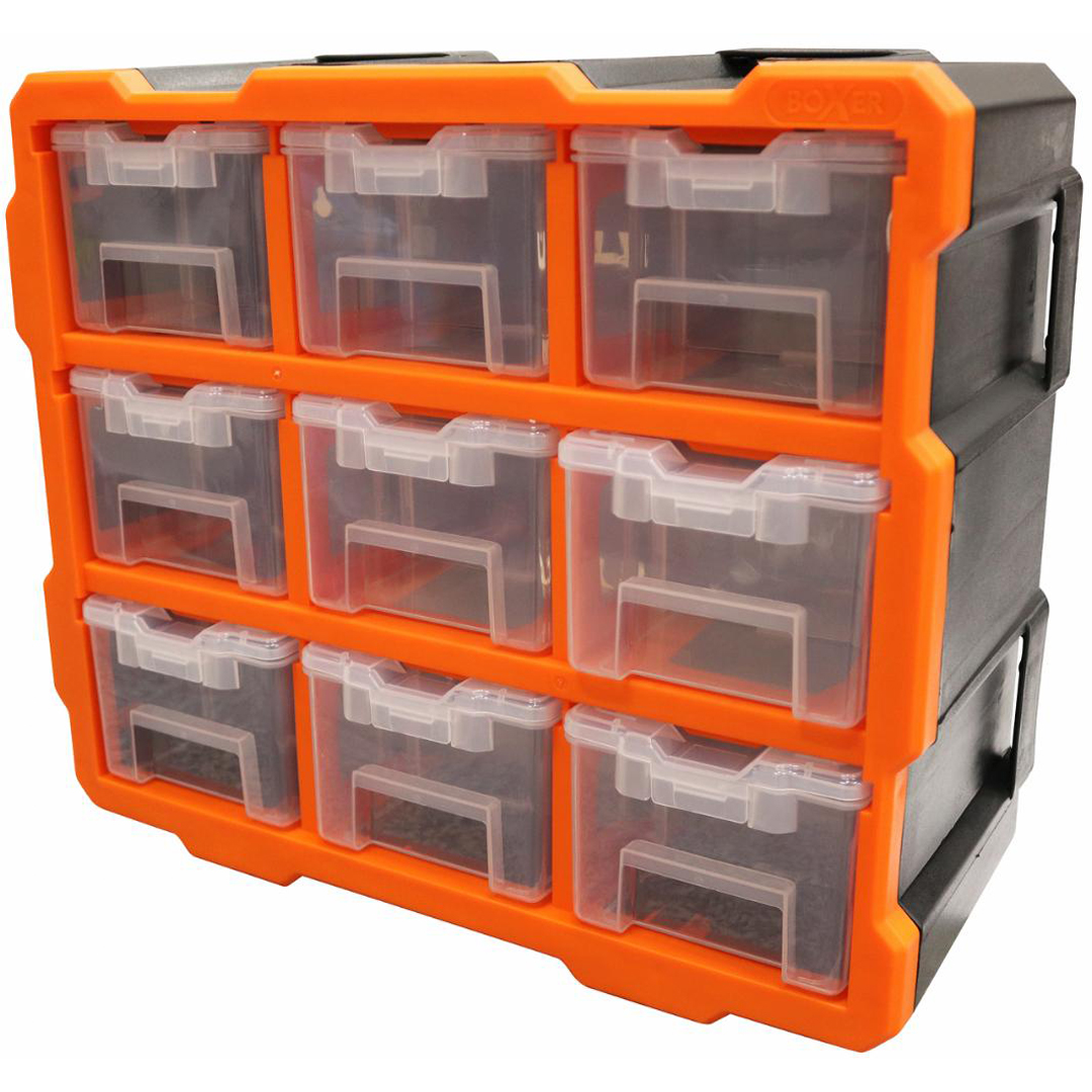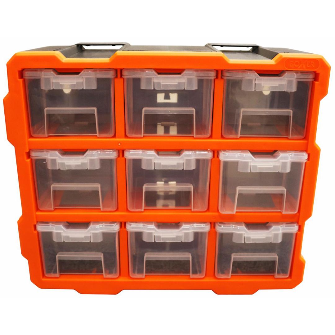 Sortimentkasse med 9 skuffer i klar plast. Kan henges på veggen eller stables. Ramme og skuffer i PP.