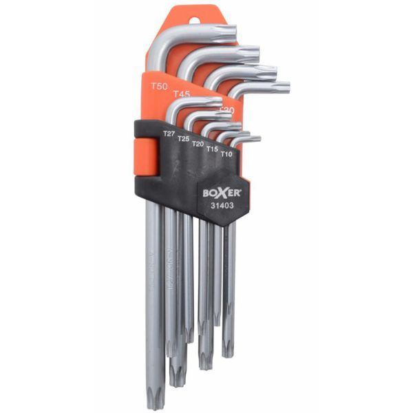 Nøkkelsett Torx med kulehode – 10 deler. TORX: 10-15-20-25-27-30-40-45-50. CrV-stål. Leveres i praktisk holder.