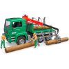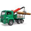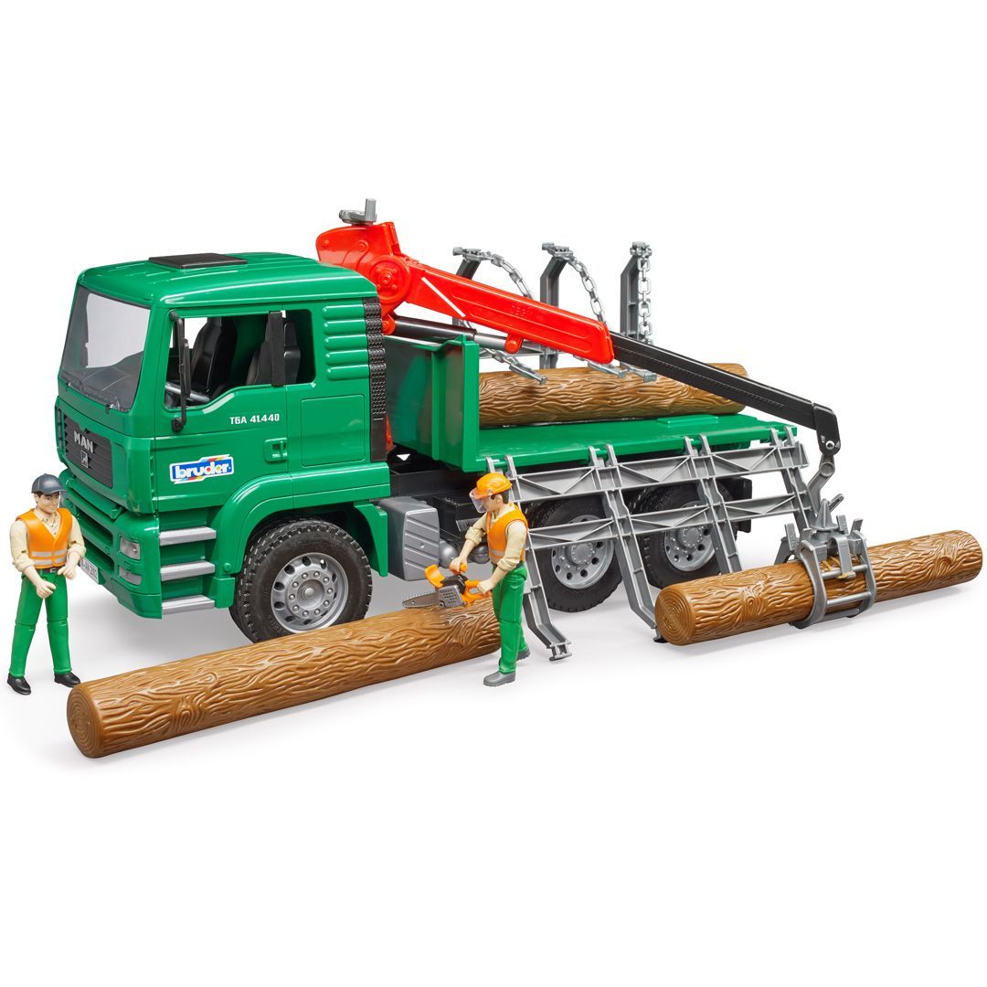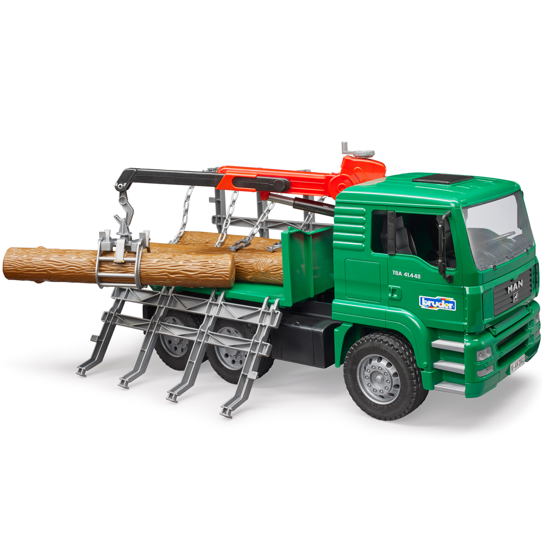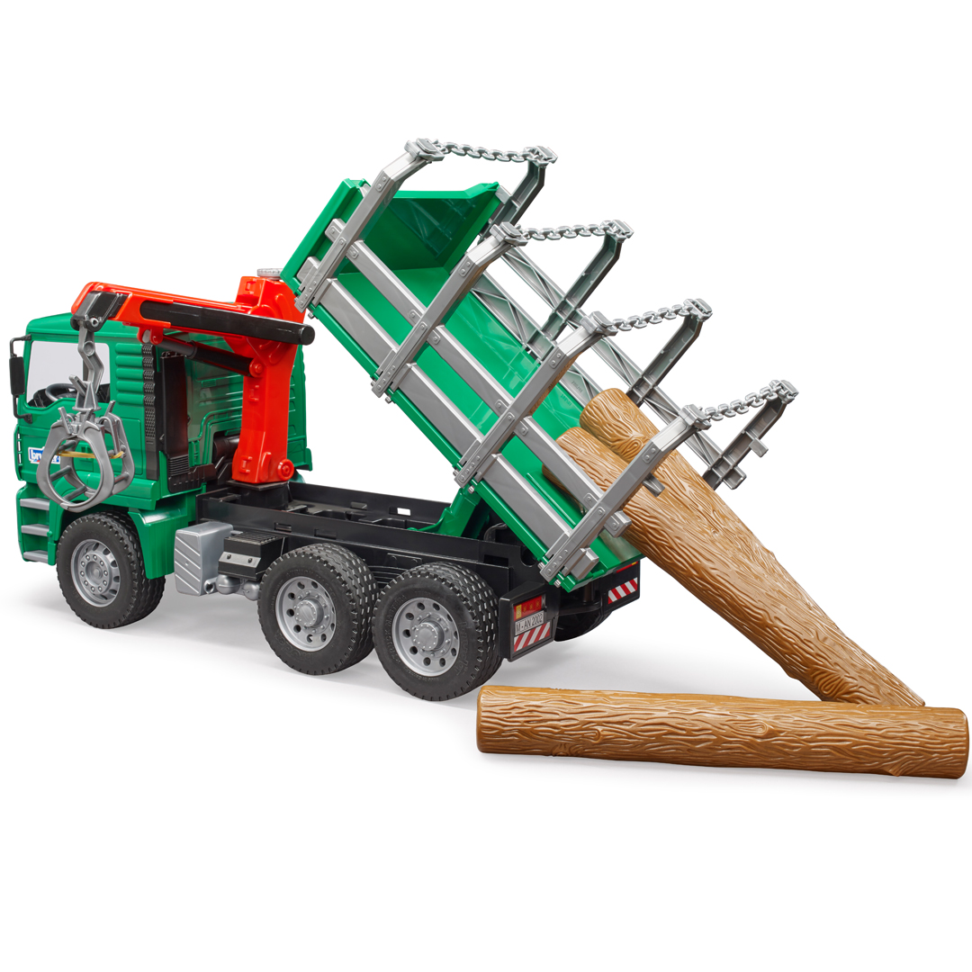 Håndter de tre medfølgende tømmerstokkene med kranen som er festet til lastebilen, før du sikrer dem på lasteplanet med de svingbare sidene og kjettingen. Og når det er på tide å kvitte seg med lasten er det bare å vippe opp lasteplanet. Førerhuset kan også vippes frem. Sidespeilene kan foldes inn, og tømmerbilen har gummilignende dekk.