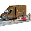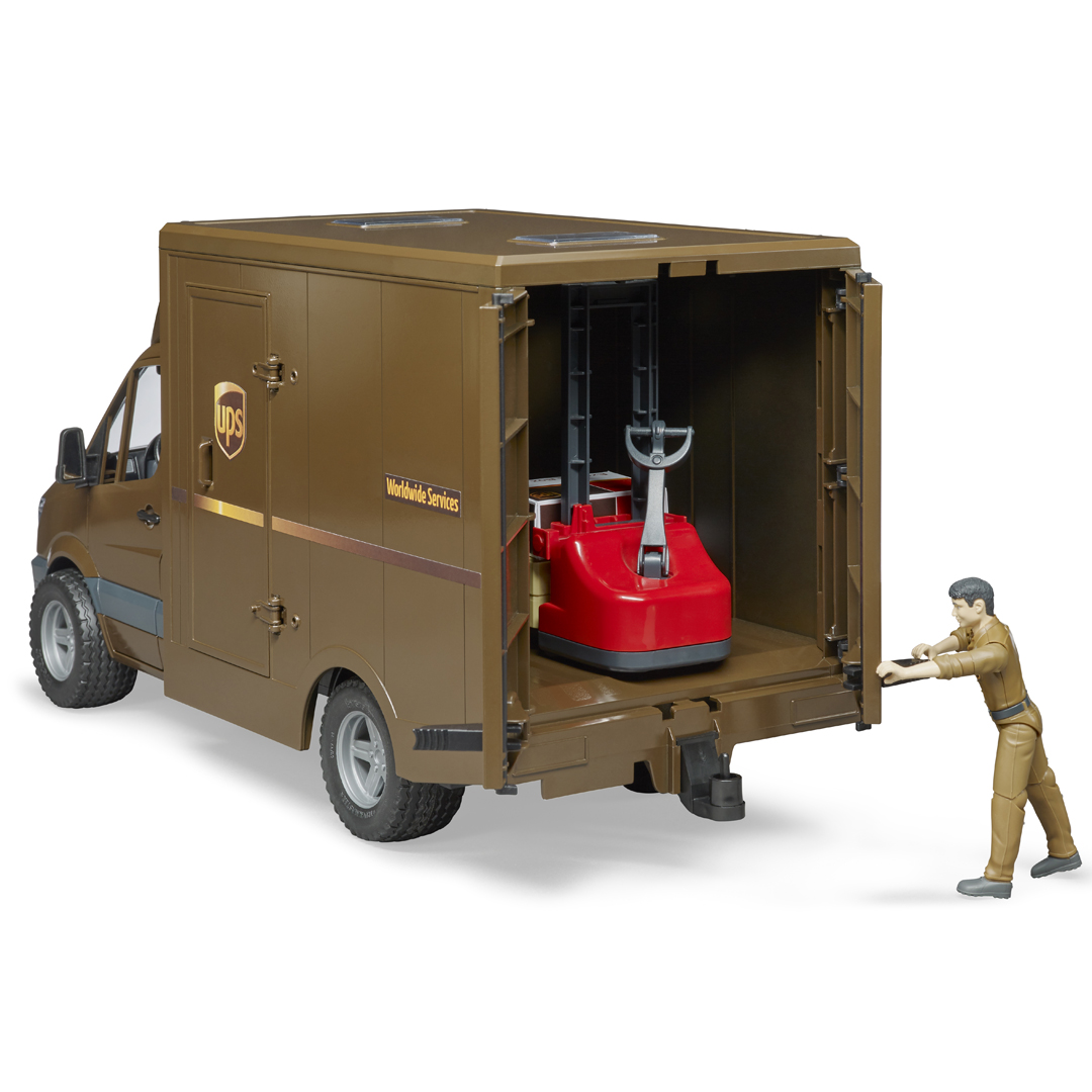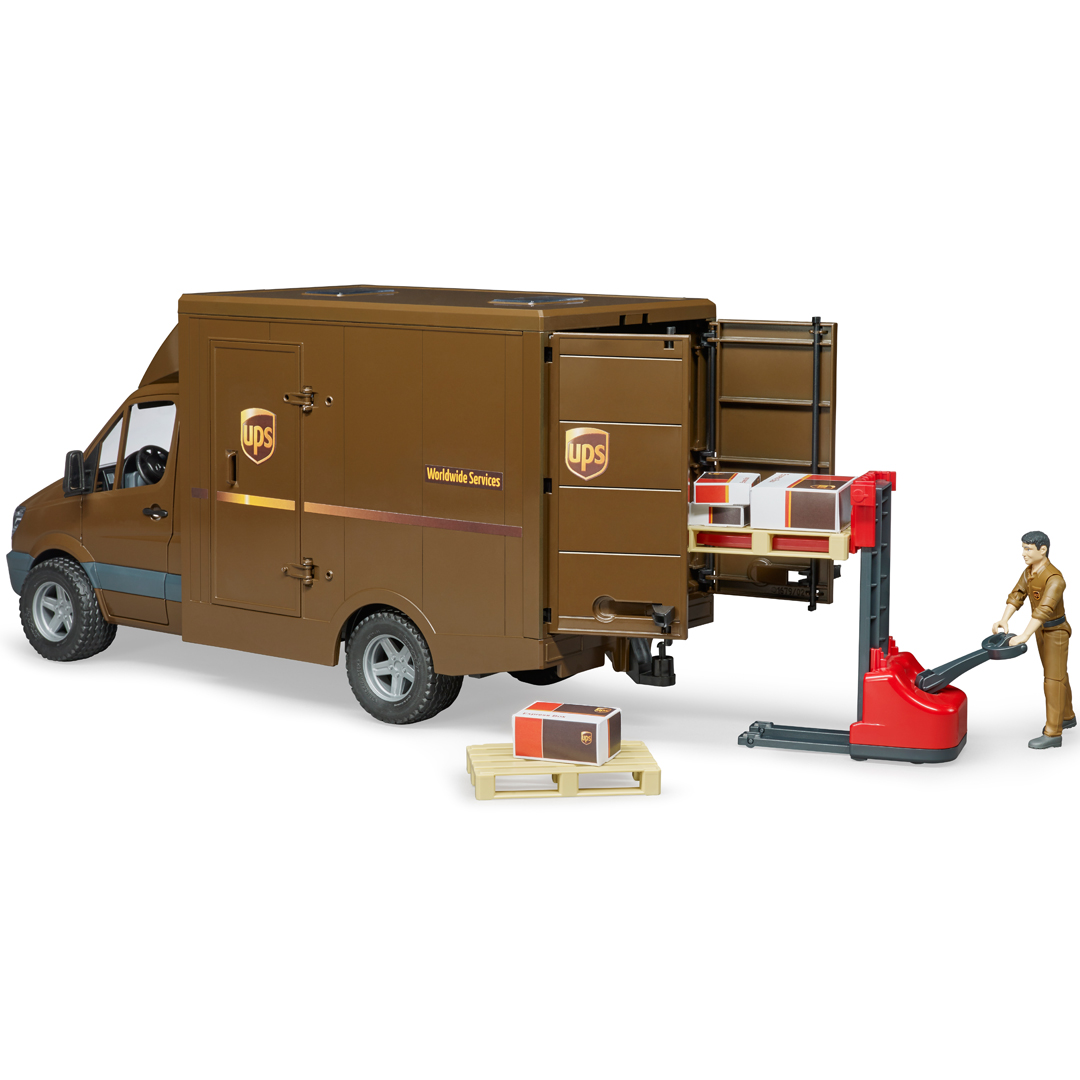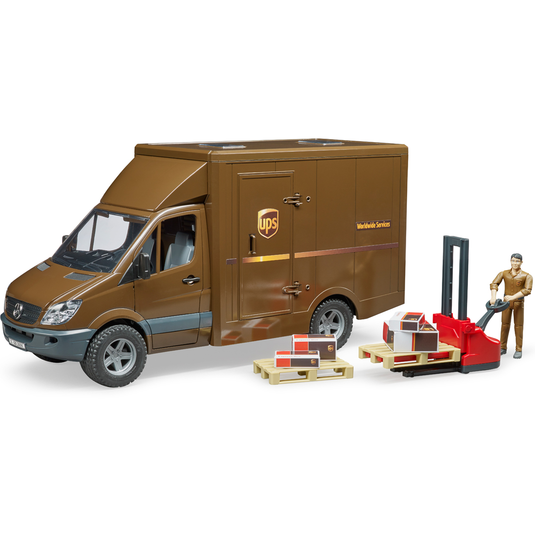 UPS er en av verdens ledende aktører innen vareleveranse og bruker Sprinter daglig. Dette kjøretøyet er nå en del av Bruder-utvalget. Kjøretøyet har to dører bak som kan åpnes, og mindre deler kan flyttes inn og ut av bilen gjennom sidedøren. Kjøretøyets tilbehør inkluderer en manuell palle-jekk og to Euro-paller til å laste av og på tunge varer. Dette flotte settet inkluderer en UPS-sjåfør med uniform.