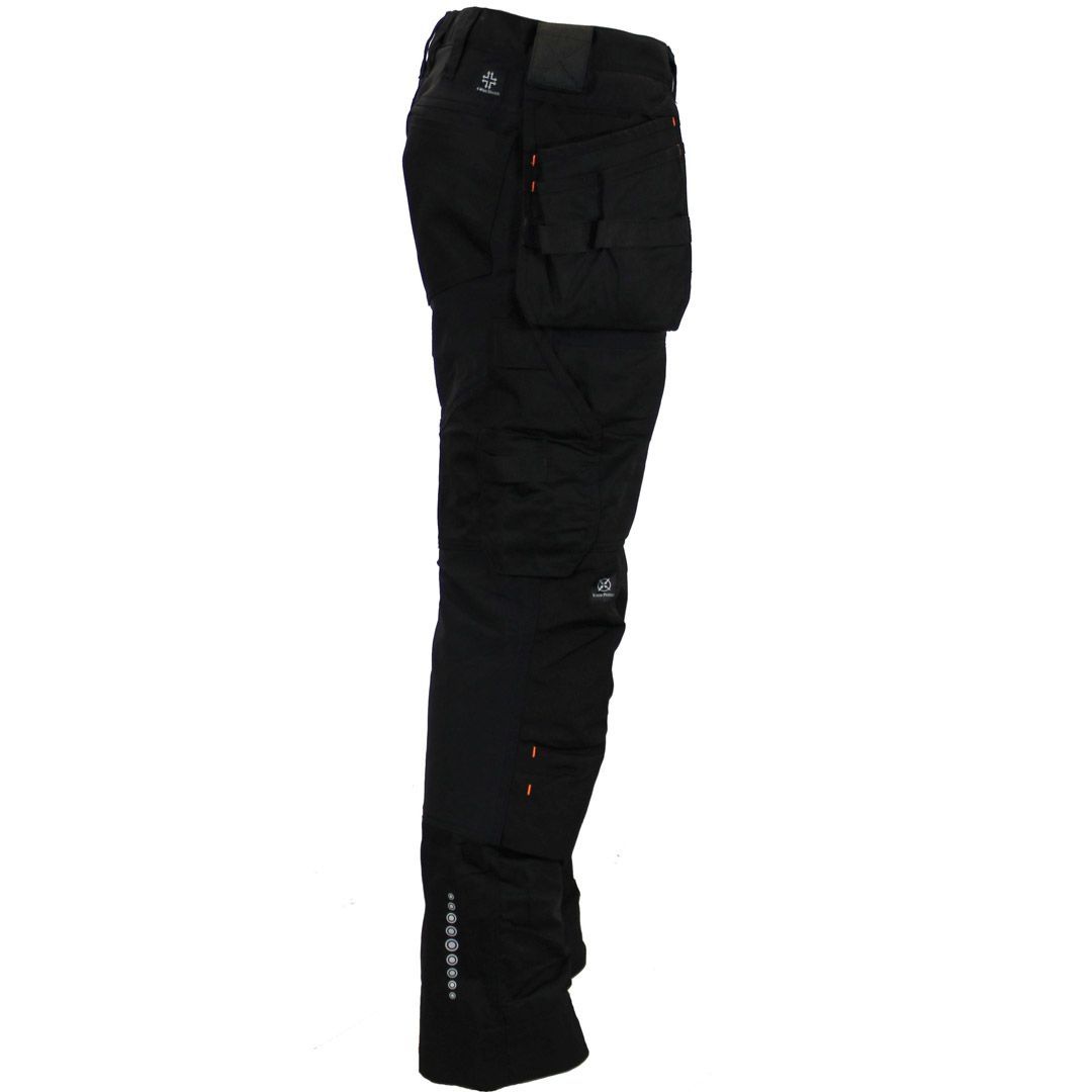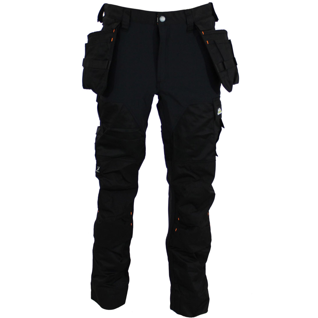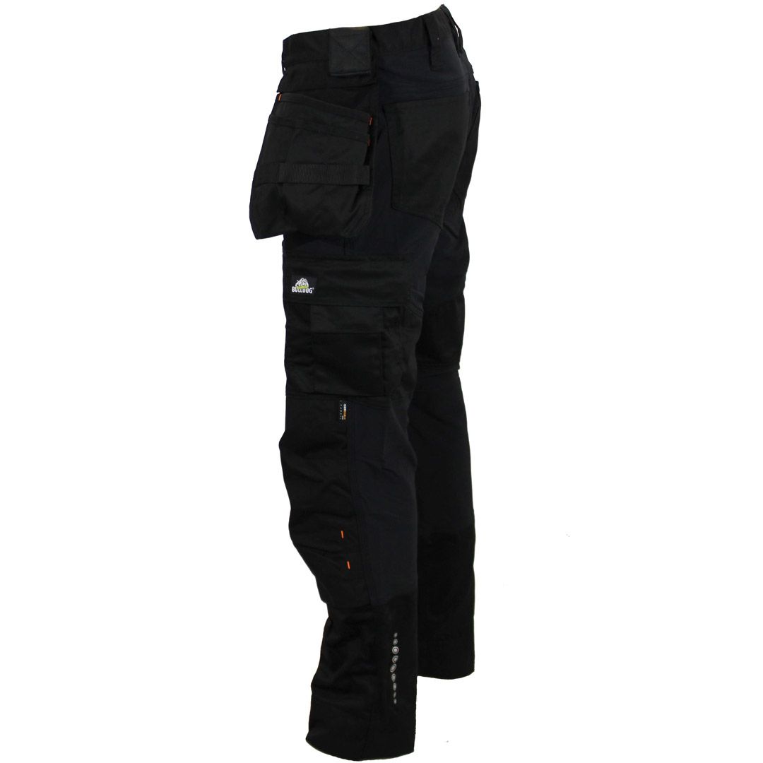 Bulldog Håndverkerbukse med 4-veis stretch. Produsert av 4-veis stretch materiale der du trenger god bevegelighet – framme og bak. Lett bukse med smal passform. 2 avtakbare spikerlommer. 2 framlommer og 2 baklommer. Lårlomme med mobiltelefonlomme. Tommestokklomme. Feste for kniv. 2 hammerholderfester. Cordura kneputelomme og innvendig i spikerlommer. Gummiert knapp i front for å unngå riper på glass, lakkerte flater etc.