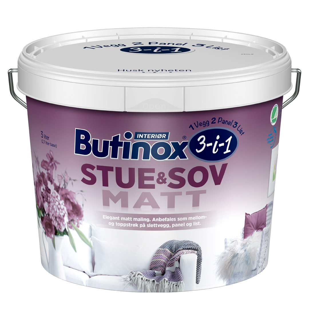 Butinox Interiør Stue og Sov matt er en høykvalitets matt, løsemiddelfri, meget luktsvak og vanntynnbar akrylmaling for innendørs bruk til vegg, panel og list. Produktet er lett å påføre, hurtigtørrende, har god dekkevne, ingen gulning, er meget slitesterk samt lett å holde ren. Malingen sitter godt på underlag som tidligere er malt med oljemaling. Malingen er et allergivennlig kombinasjonsprodukt som anbefales på både treverk og slette vegger i stue, soverom og oppholdsrom. Det benyttes som mellom- og toppstrøk på underlag som bygningsplater, glassfibervev, tapet, sandsparkel, skjøtemasse, puss, betong, panel og lister. Røres godt om. Påfør 2 strøk. Påføringsmetode. Rull, pensel el. sprøyte. Anbefalt forbruk: 8 til 10 m2 pr ltr. pr strøk.