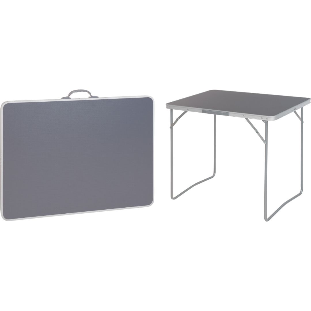 Stabilt campingbord med sort metallramme og bordplate i kunststoff med aluminiumskant. Bordet er lett, sammenleggbart og enkelt å transportere – perfekt til camping, hage, piknik eller hyttetur. Bena kan foldes under platen, og bærehåndtaket gjør bordet enkelt å flytte.