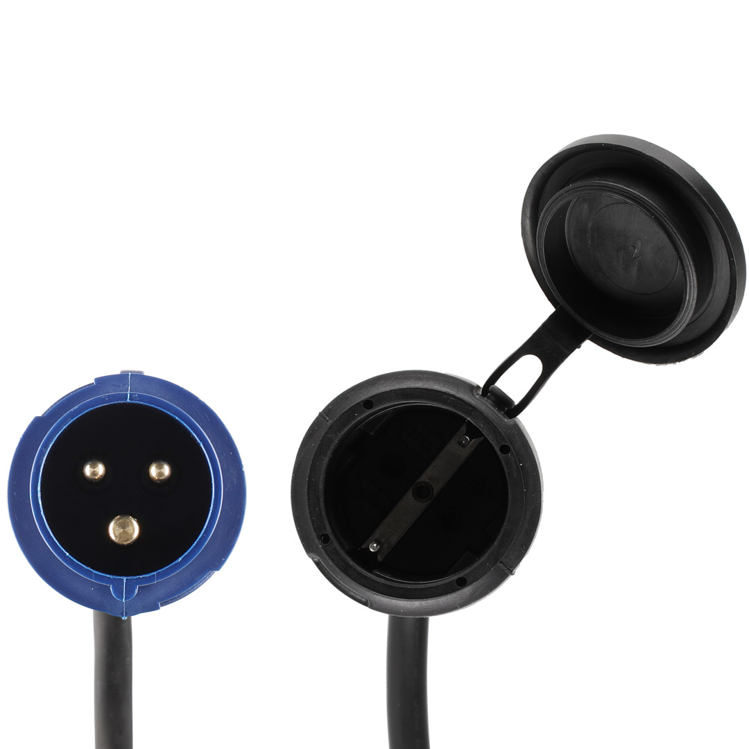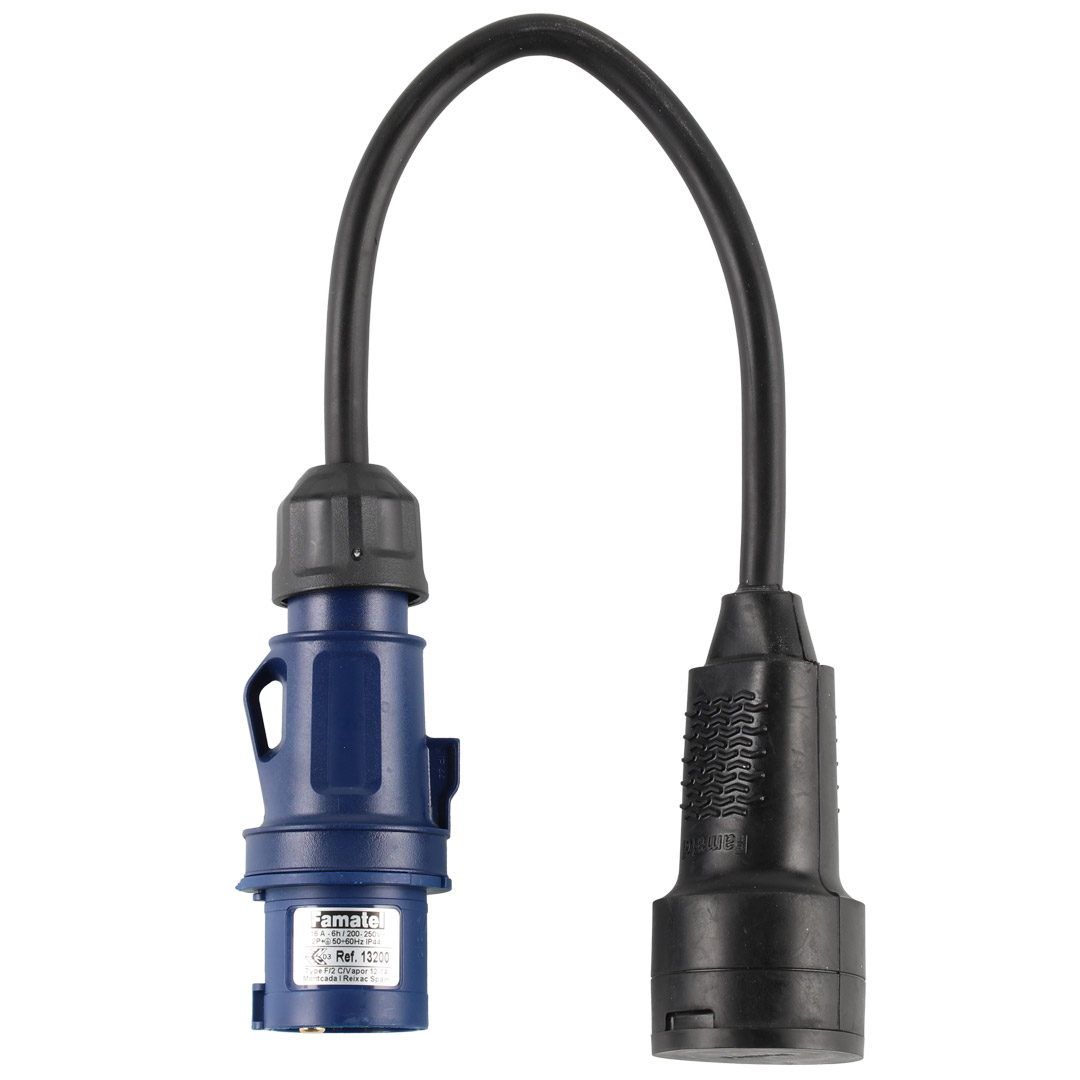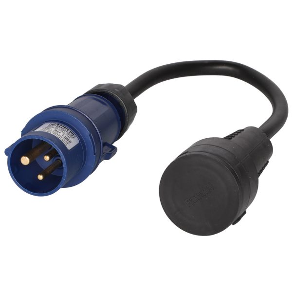 Praktisk adapter til bobil og campingvogn. Schuko stikkontakt/ CEE-Caravan plugg. Gummikabel H07RN-F 3 x 2,5mm2, lengde 0,3 m. 230 V 50 Hz, 16 A. IP44.
