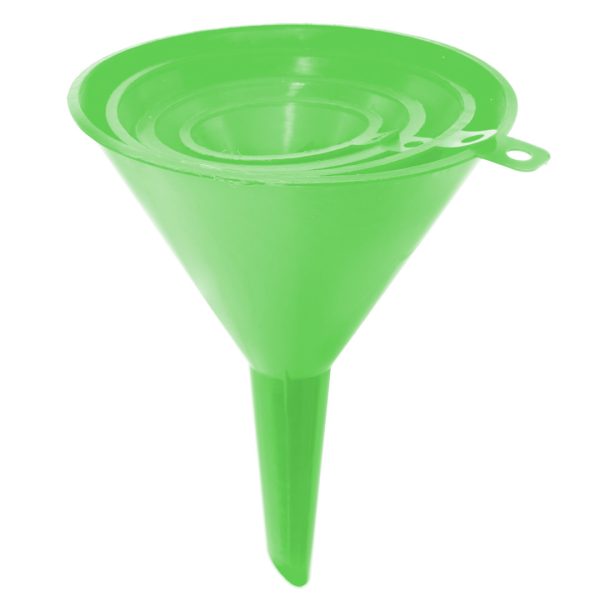Carman traktsett med 4 forskjellige trakter. Traktstørrelser 5 cm, 7,5 cm, 10 cm og 12,5 cm. Kan brukes til vindusspylevæske, oljer, bensin, etc.