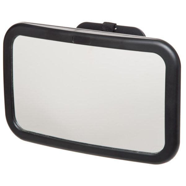 Stort buet speil til å feste på hodestøtten i baksetet. Gir sjåføren god oversikt over barnet som sitter i bakovervendt barnestol. Passer alle biler med hodestøtter i baksetet. Mål: 30,5 x 3 x 19 cm.