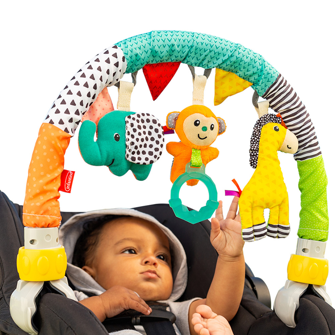Hold babyen engasjert og underholdt med denne allsidige Clip & Play vognrangle. Den universelle klemmen gjør at ranglebuen enkelt kan festes til bilseter, barnevogner eller babygym. Ranglen har tre avtakbare dyrevenner som oppmuntrer babyen til å se, gripe og slå, noe som fremmer utvikling av grovmotorikk og visuell persepsjon.