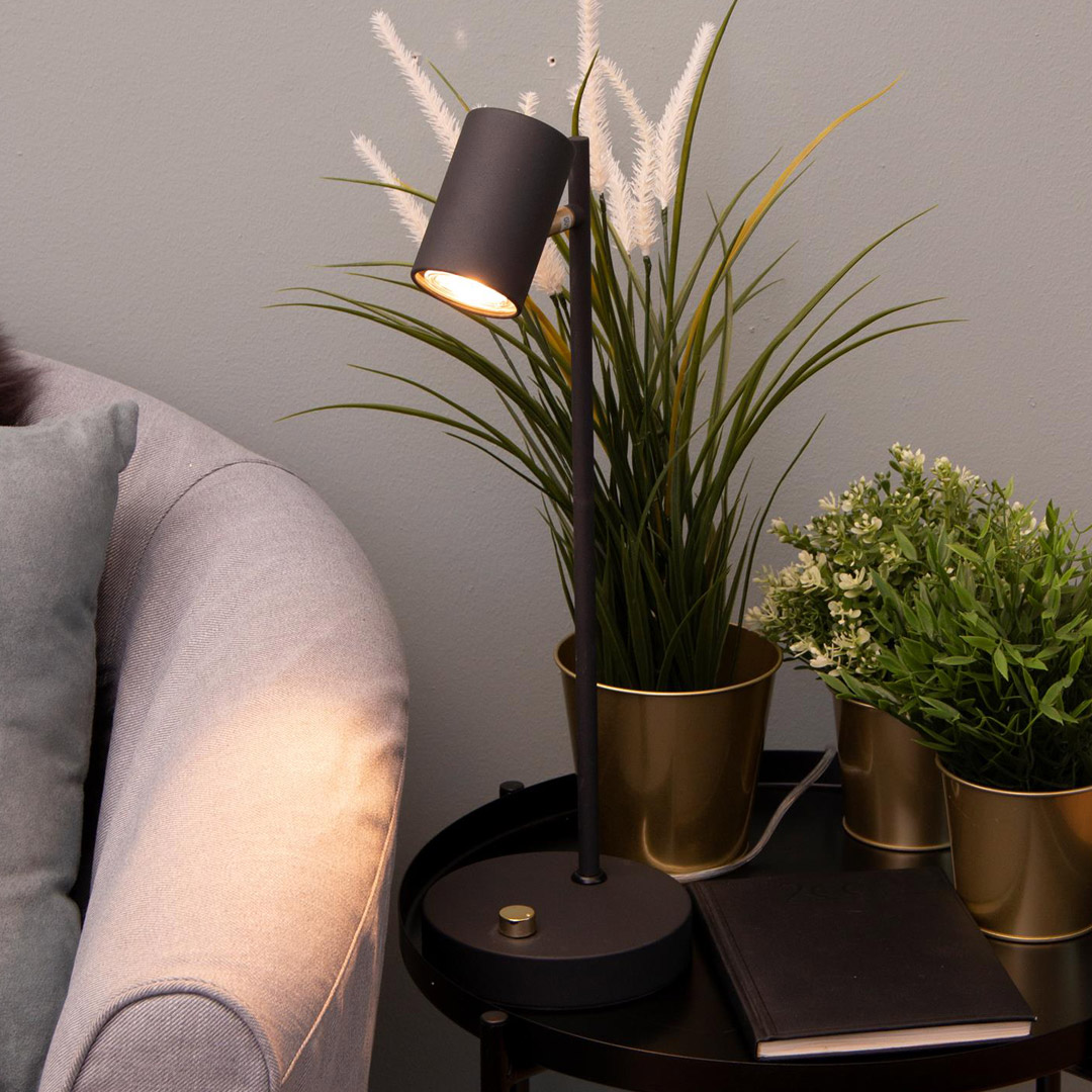 Cuba bordlampe er en moderne lampe med dimmerbryter lett plassert på foten av lampen. Denne lampen gir et retningsstyrt lys og det bevegelige spothodet gjør det enkelt å justere lyset dit det trengs.