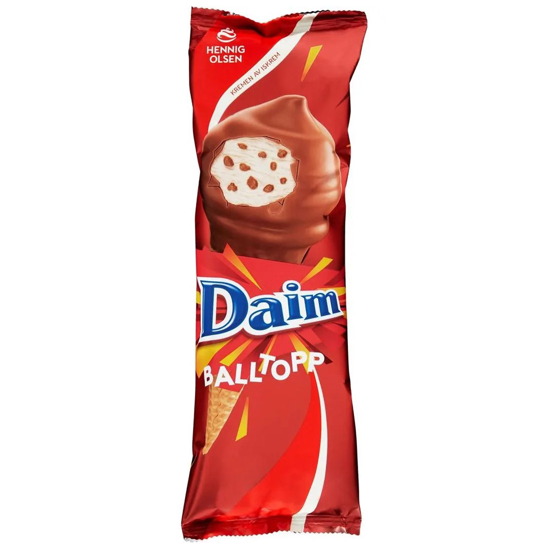 Iskremen for alle som har plass til litt til. Daim Balltop er en raus fløteis med kuler av Daim, dyppet i melkesjokolade.