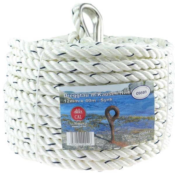 Dreggtau med høy bruddstyrke i polyester med kause. Synker. Lengde 40 meter. Tykkelse: 12 mm.