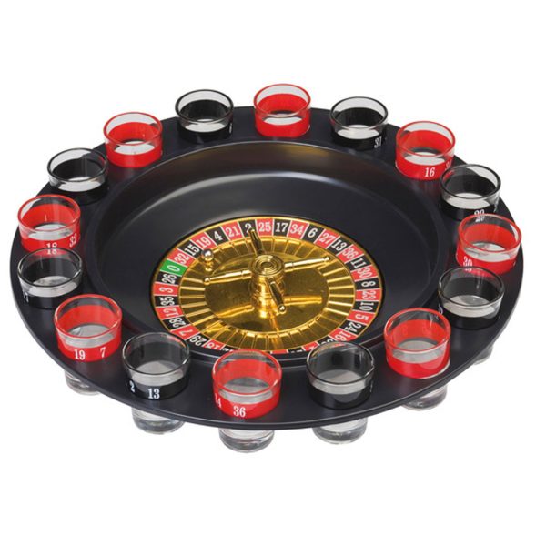 Drink Roulette drikkespill. Inneholder 1 stk rouletthjul, 16 stk shotglass og 2 stk metallkuler.