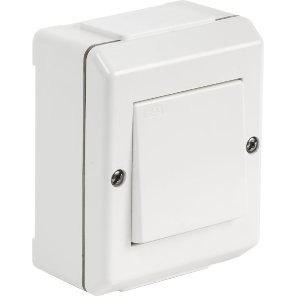 Påvegg bryter med skruklemme. Leveres med membran nippel med dobbel gjennomføring. Kan kobles sammen med andre brytere og/eller stikkontakter med skjøtestykke.