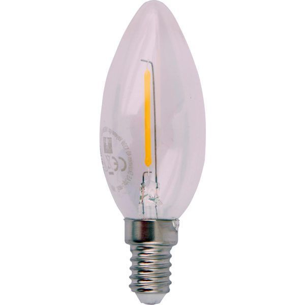 Filament LED er en lyspære som passer perfekt brukt i interiør som stuer, kjøkken, soverom osv. der man ønsker god lyskvalitet som denne lyspæren gir. Lyspæren er til forveksling svært lik de gamle gode glødepærene som har vært i bruk i mer en 100 år, men med et langt lavere energiforbruk. 60 Lumen tilsvarer 10 Watt. Farge temperatur (Kelvin): 2700 (Varm hvit). Lumen: 60 ?10 %. Fargegjengivelsesindeks: (Ra) >90. Dimbar: Nei. Levetid: opp til 25 000 = 25 år (ved 2,7 timer pr dag). Spredning på lyset: 360. Opptenningstid til 100% av lyseffekten: Umiddelbart. Antall tennsykluser: 15 000. Opprettholdelsesfaktor for lyseffekten på slutten av den nominelle levetiden: 70 %. Form: Mignonpære. Høyde: 95mm. Diameter: 35mm. Lyspærens arbeidstemperatur: -30 C til +40 C. Lyspærens sokkel: E14. Spenning: 220-240V. Watt: 1W. Kvikksølvmengde: 0 mg. UV filter: Ja. CE merket: Ja. RoHS: Ja. Energiklasse: A++.