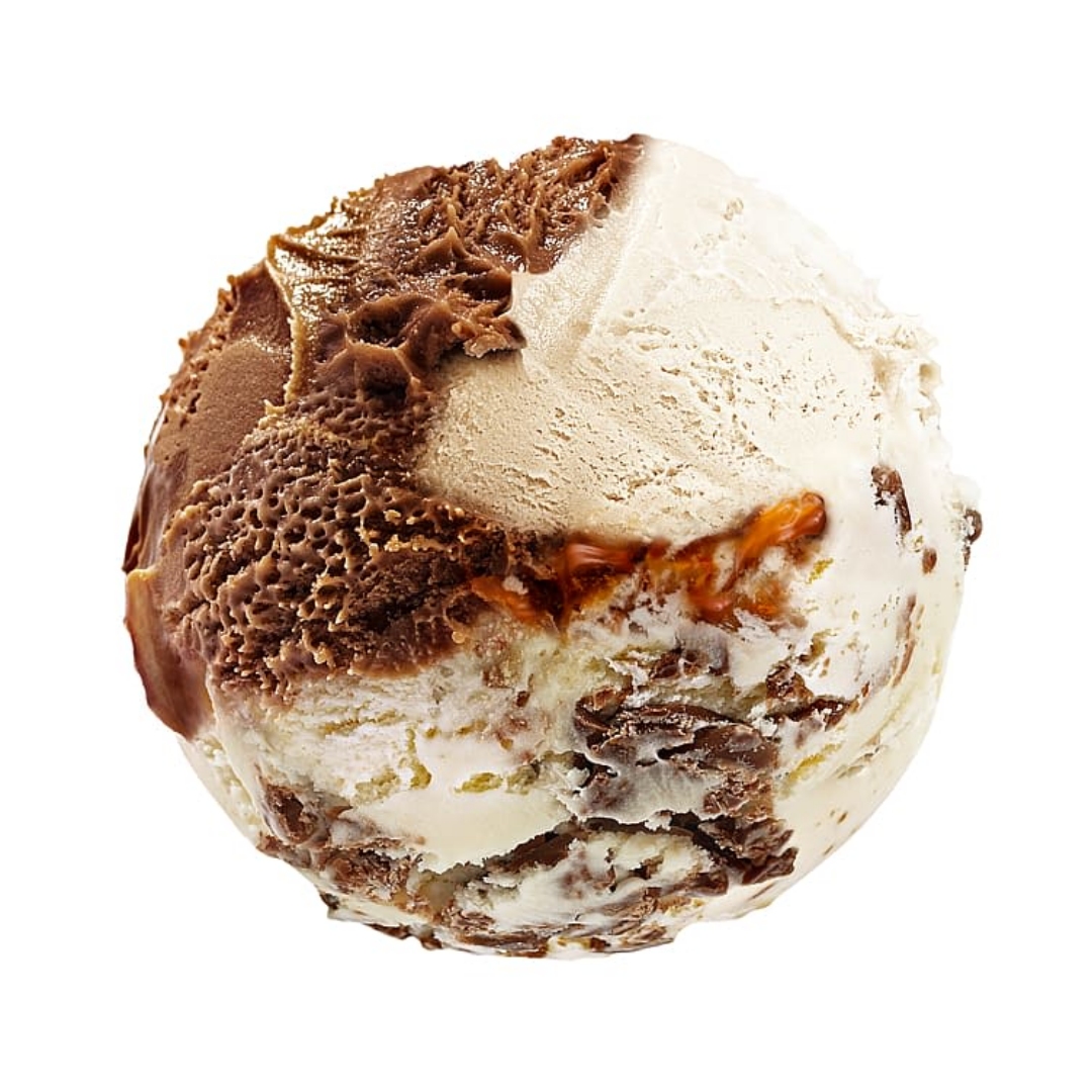 Fløteis med vaniljesmak og fløteis med melkesjokolade, tilsatt biter av melkesjokolade og toffeesaus (Smil).