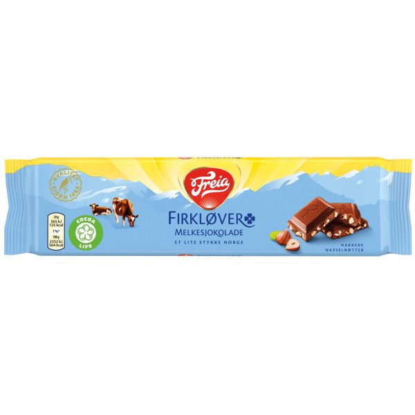 Firkløver består av Freia Melkesjokolade og hakkede røstede hasselnøtter. En velsmakende klassiker med knasende nøtter som smelter på tungen.