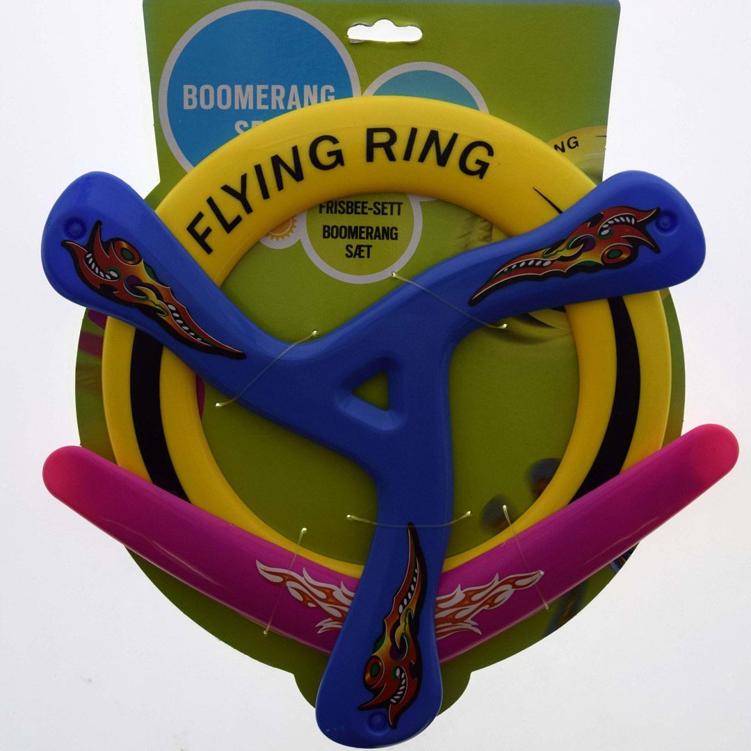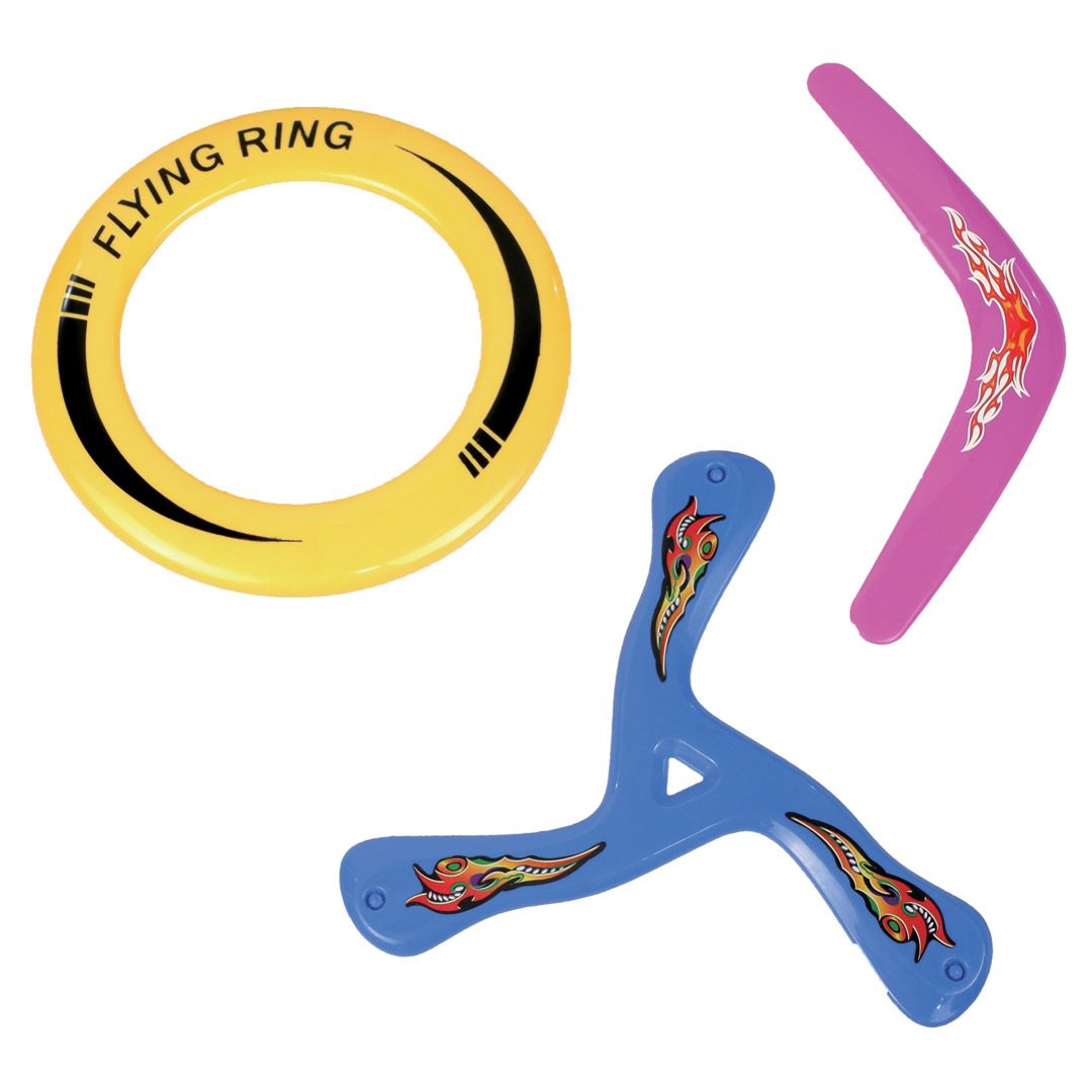 Settet består av tre forskjellige boomeranger. Den trekantede boomerangen er enkel å holde i og kaste og er derfor god for begynnere. Den runde flying ring kan kastes lenger enn noe annet! Så du kan prøve å se hvor mange meter du kan kaste den. Til slutt er det også en klassisk boomerang som er designet for alltid å vende tilbake til den som kaster.